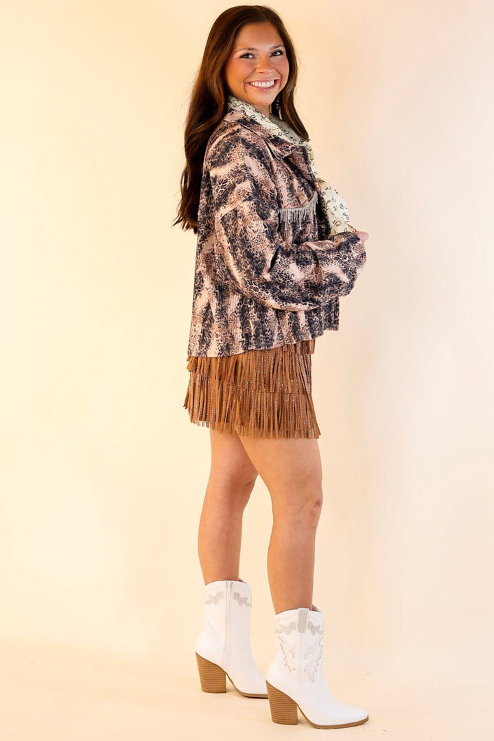 Chic Discovery Button Up Corduroy Animal Print Jacket with Crystal Fringe in Blush Pink and Black