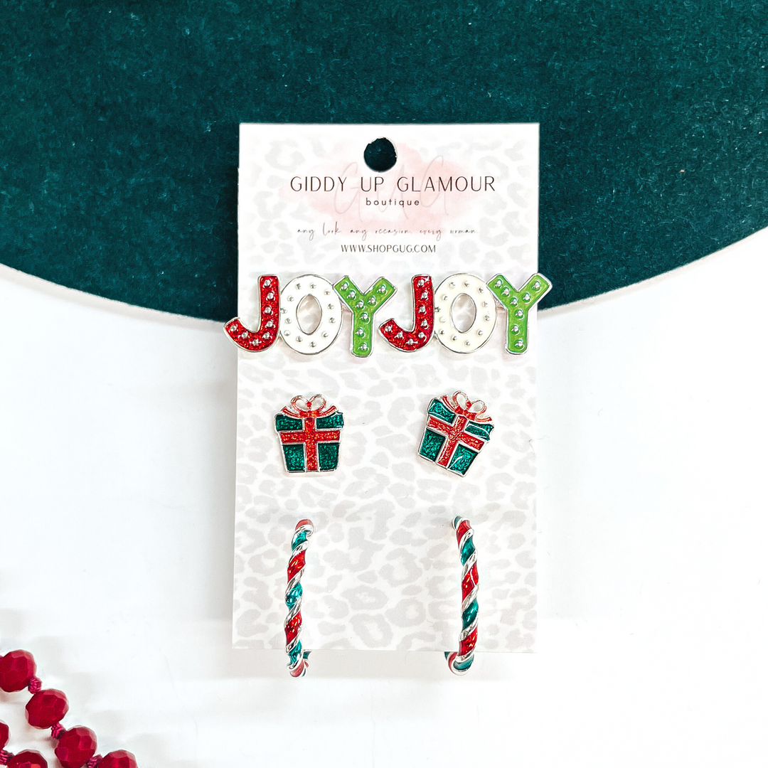 This is a set of three earrings in green, red, and white. From top to bottom;  Joy studs in red, white, and light green with small silver dots all over. The  middle pair are christmas presents in red and dark green. The bottom  earrings are small/medium twised hoops in red, gree, and silver. These  earrings are placed on a Giddy Up Glamour card, they are laying on a dark  green felt hat brim and white background with red beads in the corner as decor.