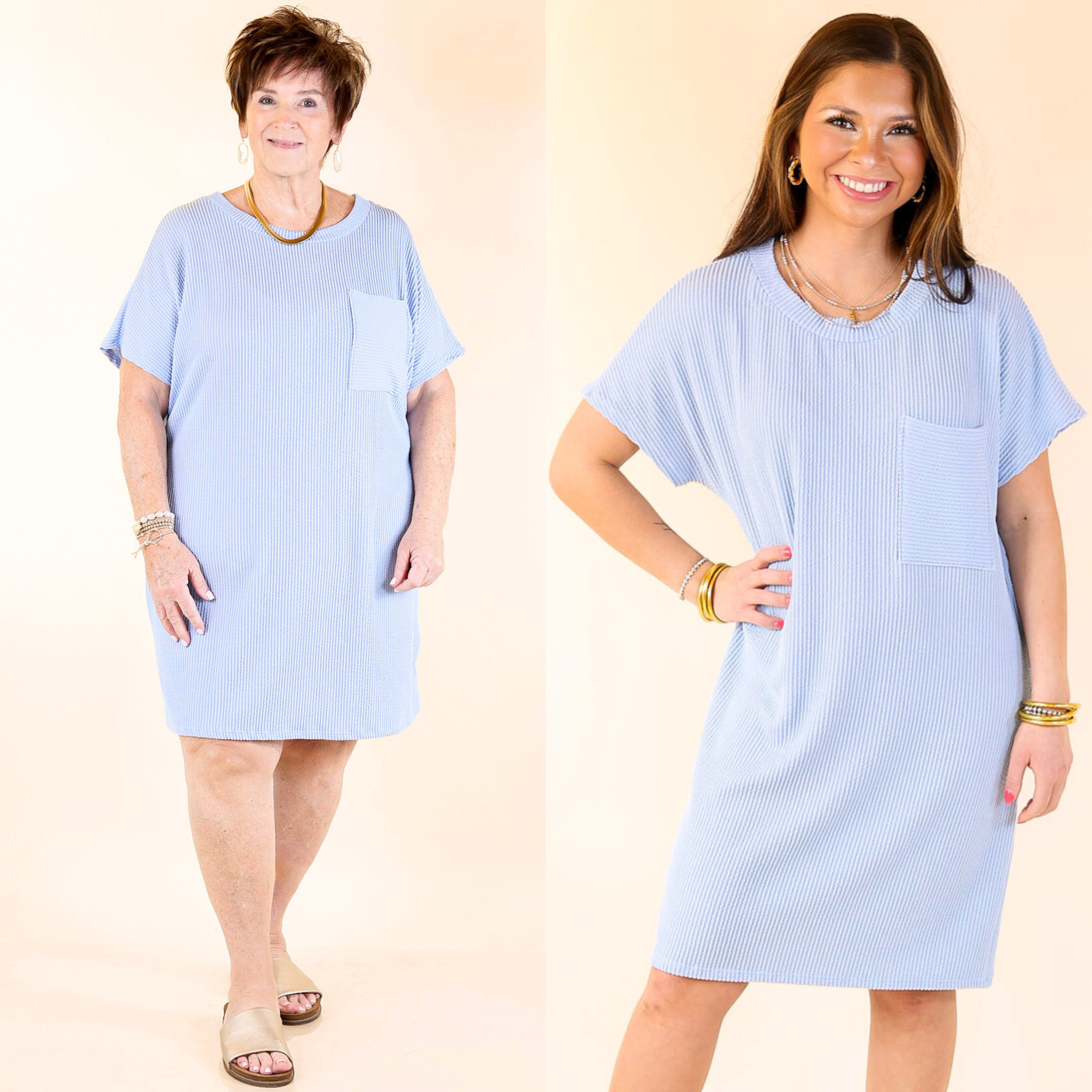Coffee and Carefree Ribbed Short Sleeve Dress with Front Pocket in Sky Blue