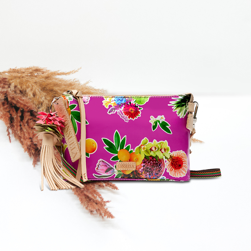 Juicy florals and fruits come alive on a bright shade of berry. Keep your phone, keys, and wallet in this take-anywhere crossbody! An open pocket and a credit card slot pocket make this bag a go-to heading out the door.