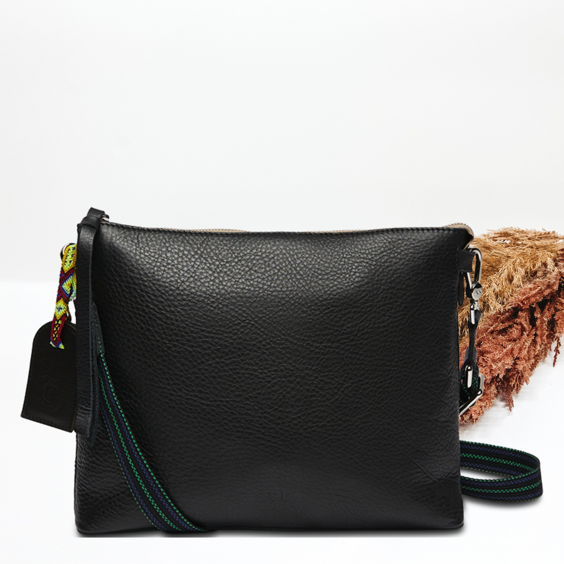 - Includes detachable and adjustable woven crossbody strap