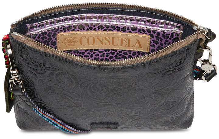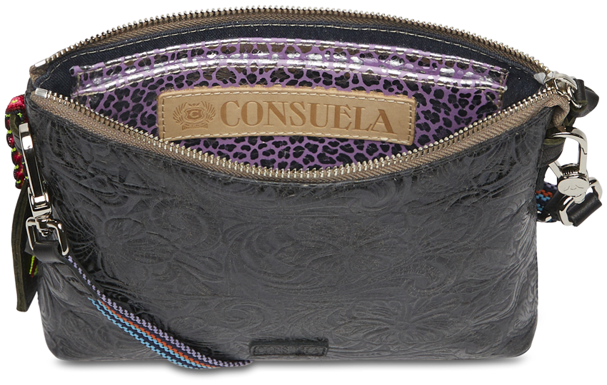 Pictured on a white background is an midtown corssbody purse with a black leather wristlet strap and a woven crossbody strap. This purse has a white with a black leather tooled print.