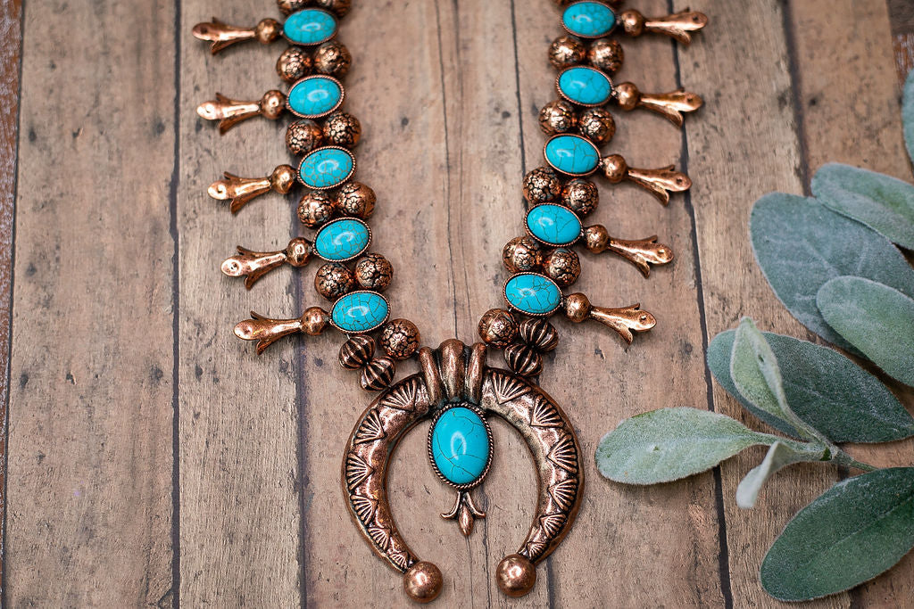 Copper Tone Squash Blossom Necklace with Turquoise Stones