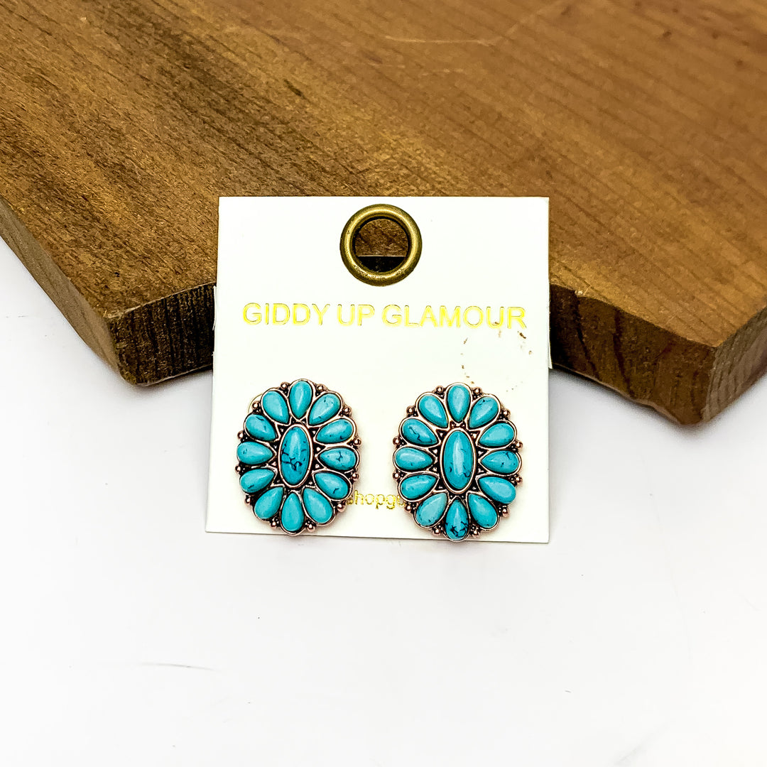Copper Tone Concho Cluster Oval Earrings in Turquoise Blue