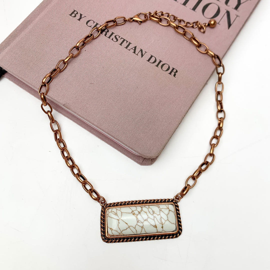 This stylish necklace features a copper-tone chain with a marbled, rectangular pendant, perfect for adding unique texture and color to your ensemble. It makes a beautiful addition to your jewelry collection.