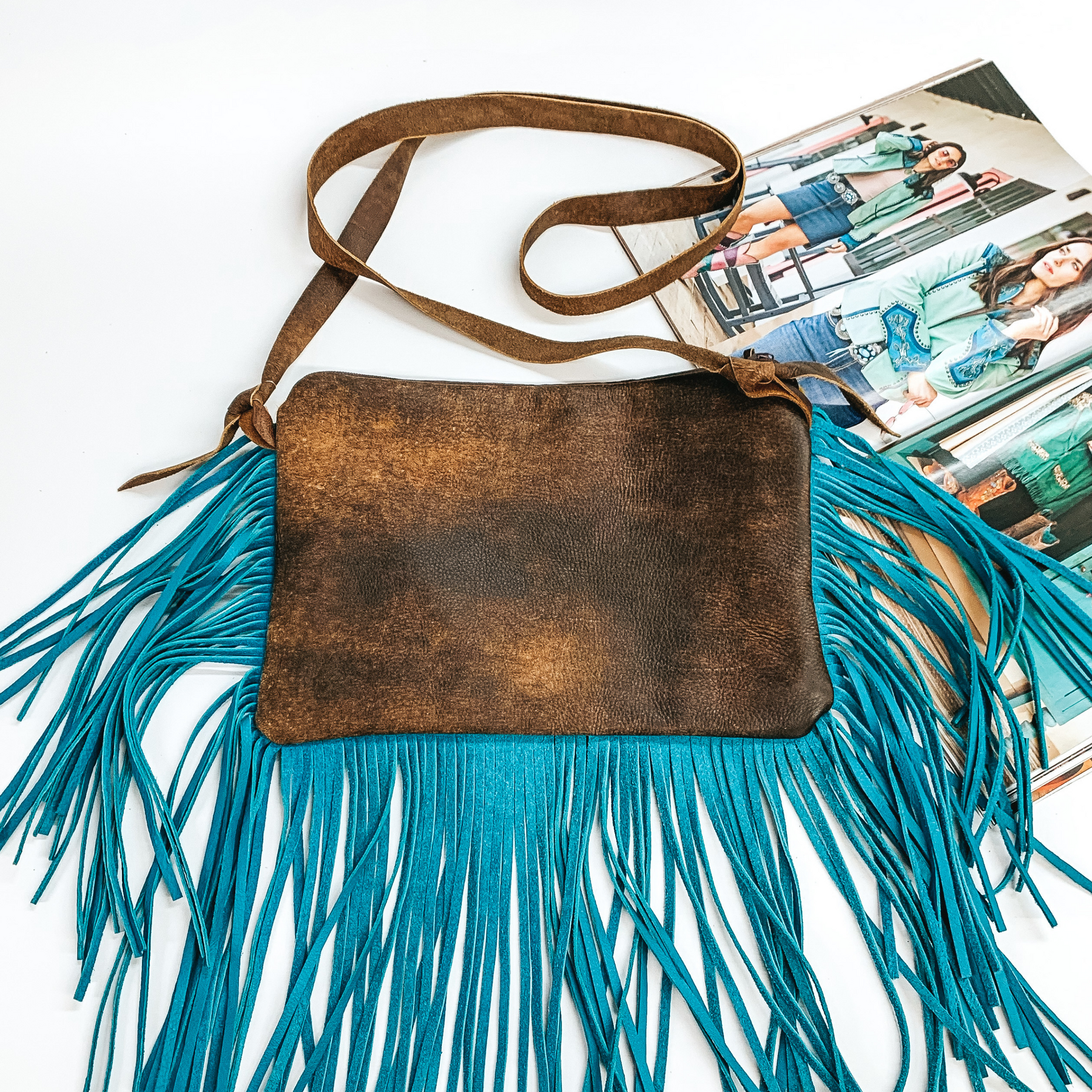 This purse genuine cowhide colored yellow and genuine leather turquoise colored fringe outlining the purse that hang down about 8 inches from the bottom of the purse. This purse also includes a genuine leather purse strap and zipper closure.