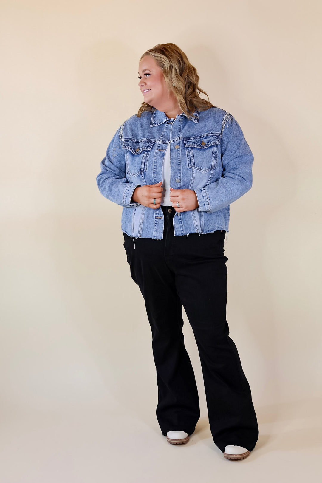 Just A Glimmer Crystal Fringe Shoulder Cropped Denim Jacket - Giddy Up Glamour Boutique