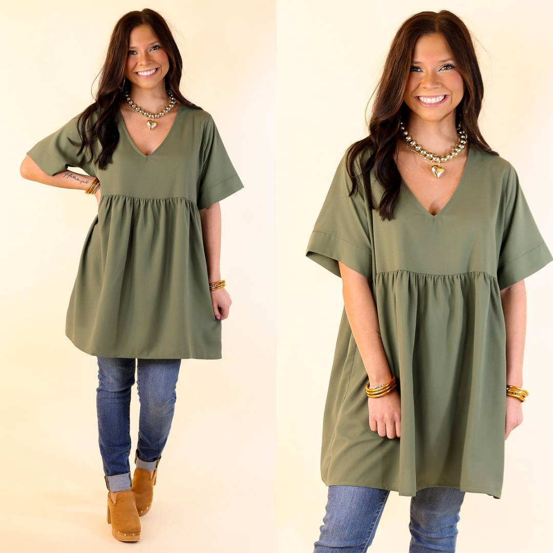 Daily Delight Short Sleeve V Neck Babydoll Top in Light Olive Green