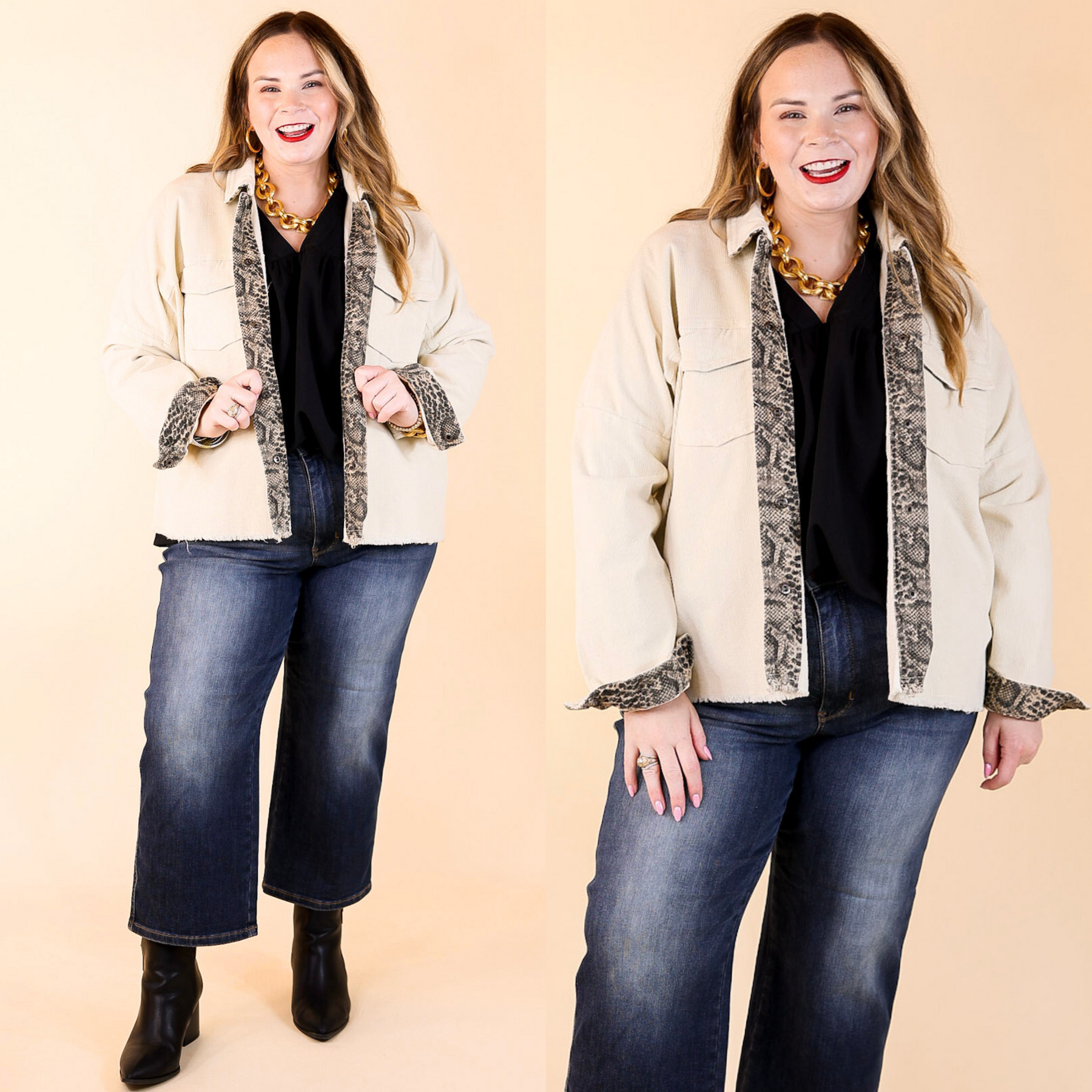 This adorable shacket is giving us all of the Fall vacation vibes! It includes a button up front, front pockets, a mix of snakeskin and leopard on the lining of the buttons and the inside of the collar, a corduroy body, and a raw hem.