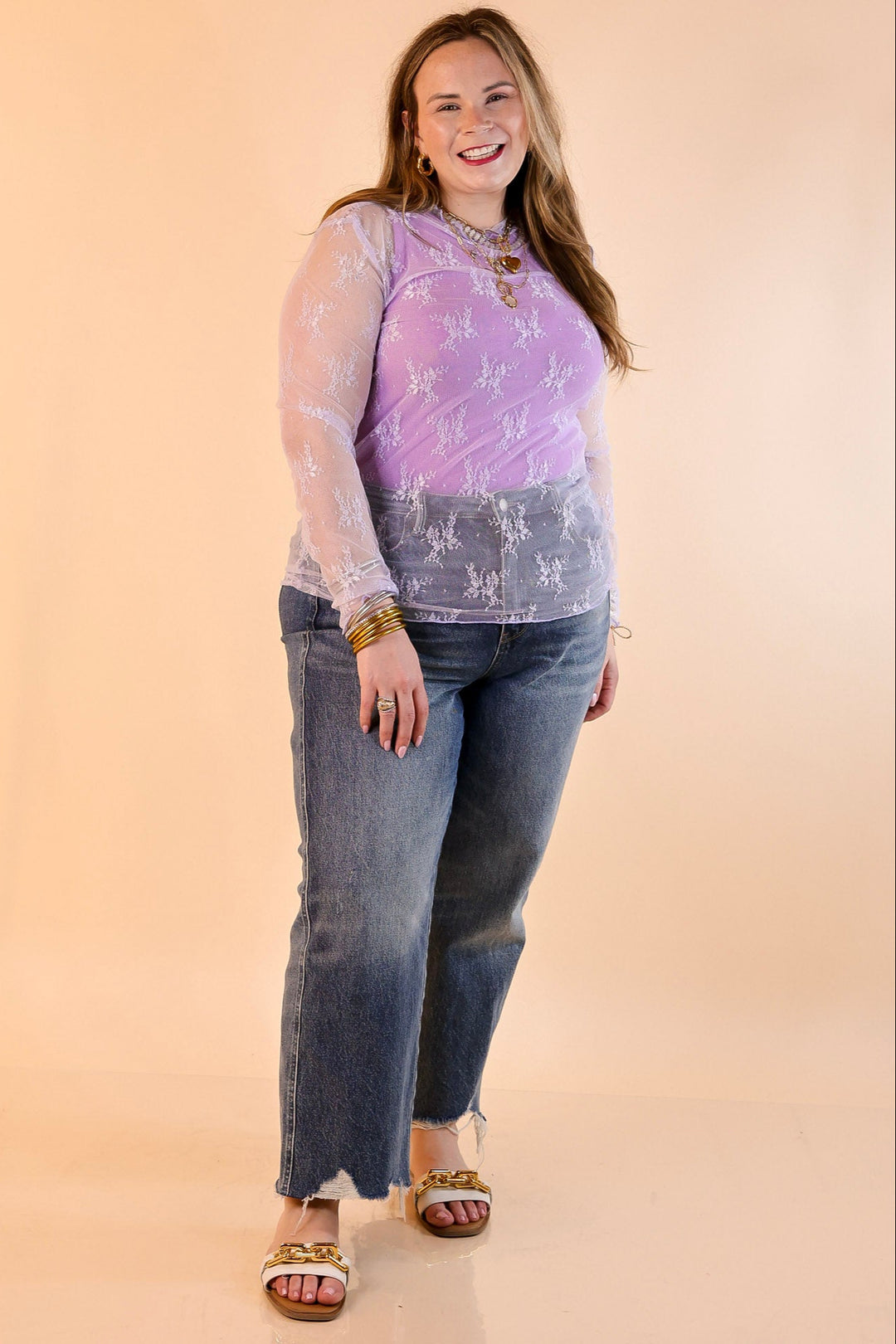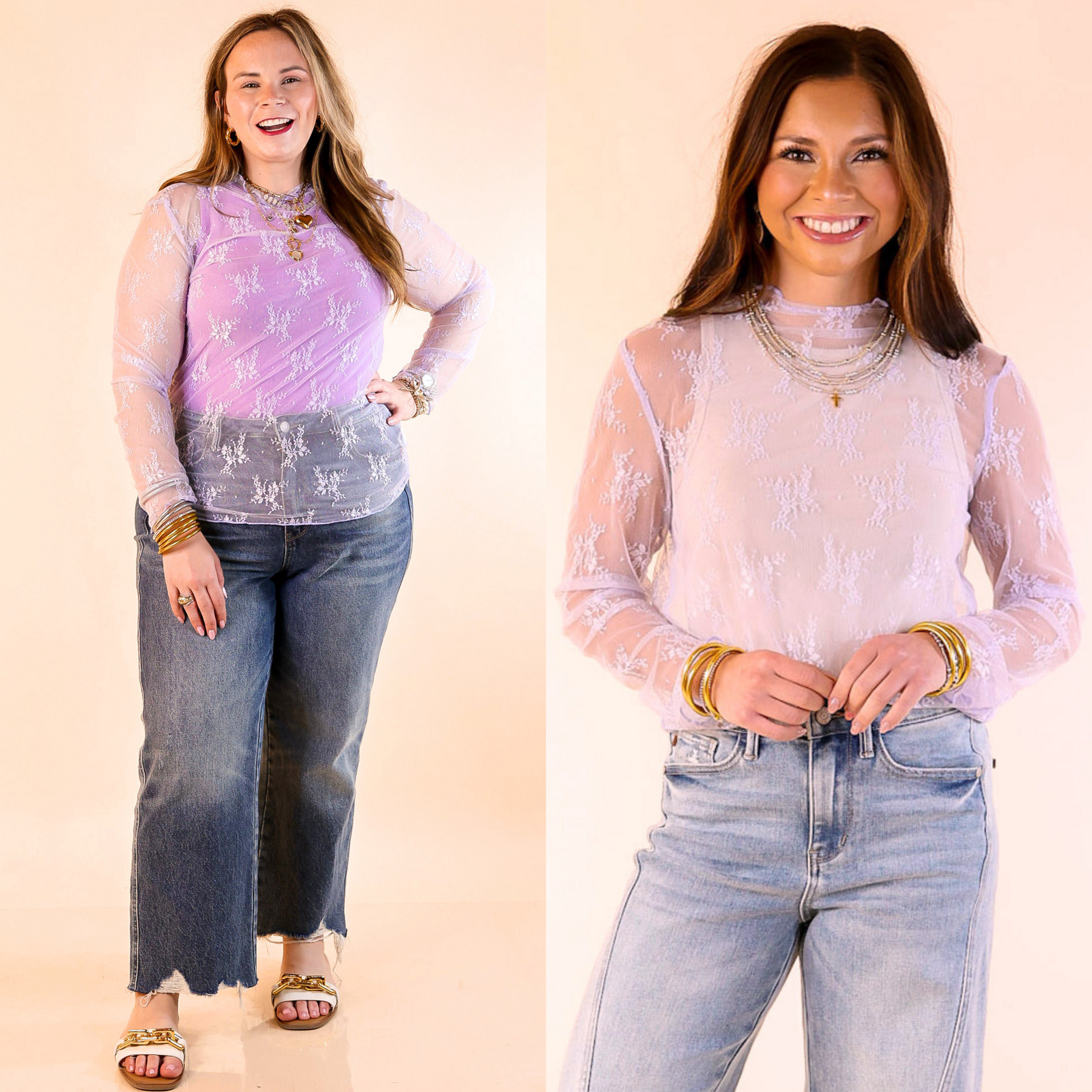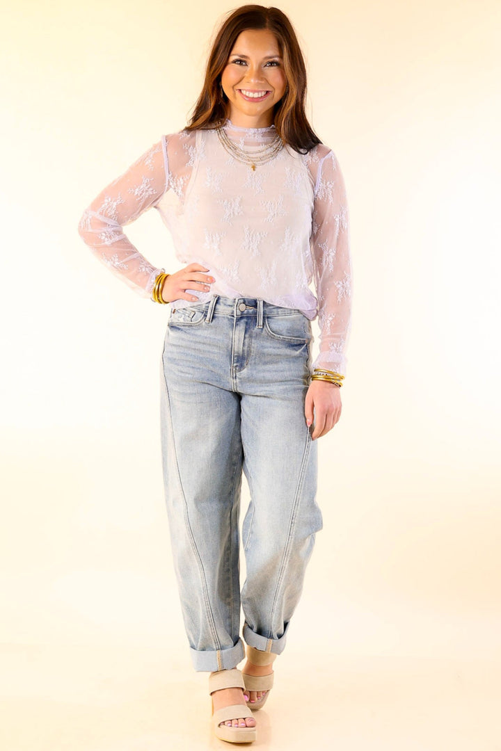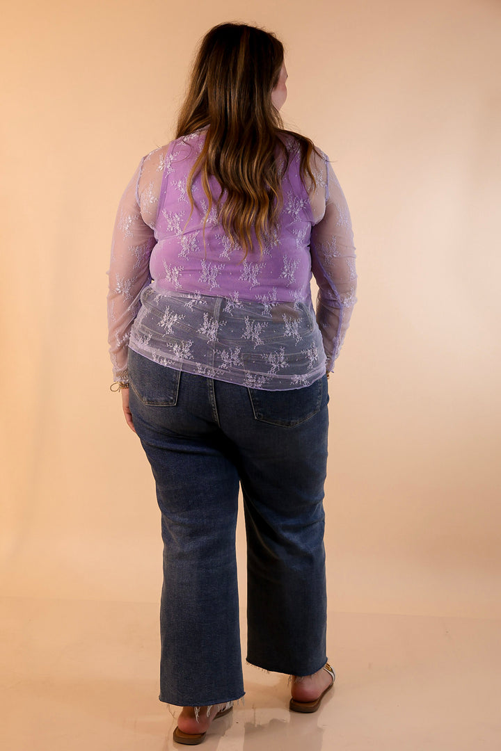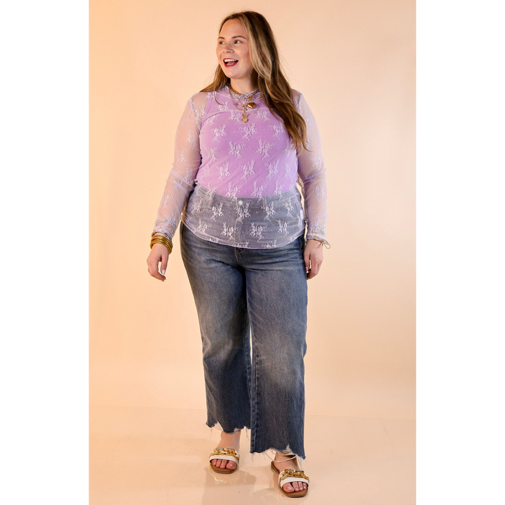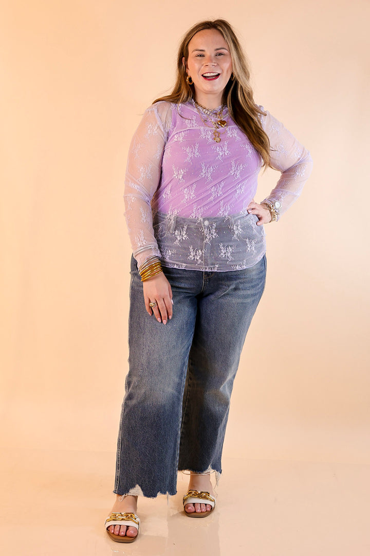 Delicate Charm Long Sleeve Sheer Lace Top with Mock Neck in Lavender Purple