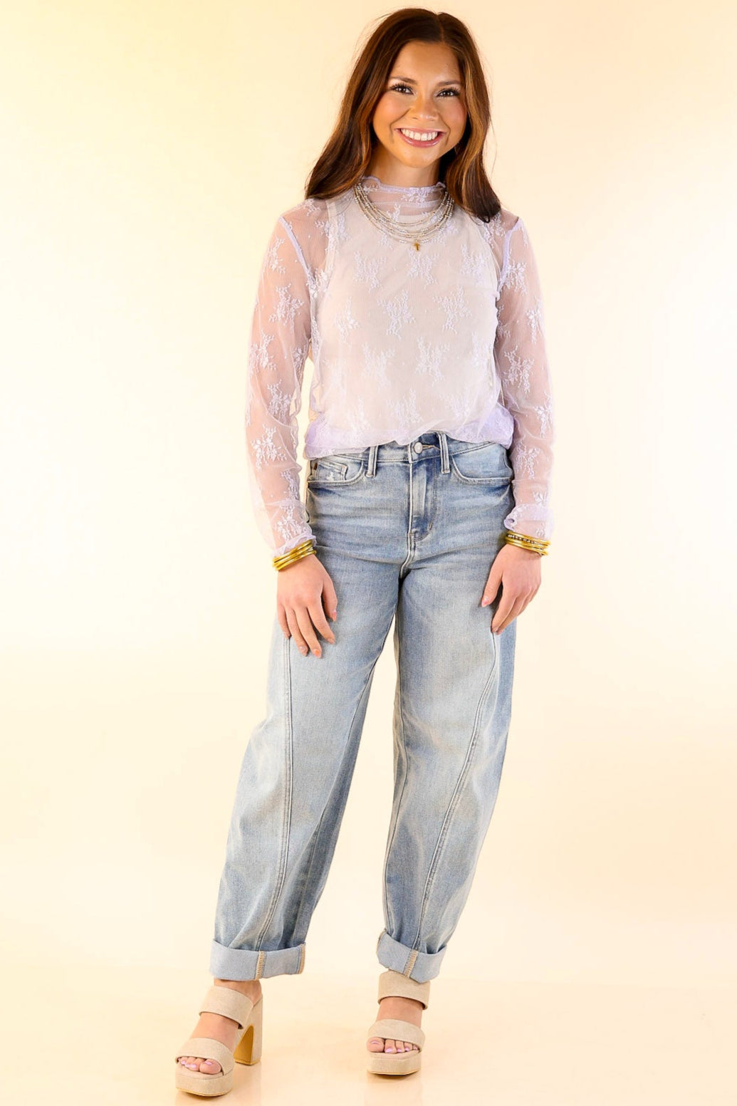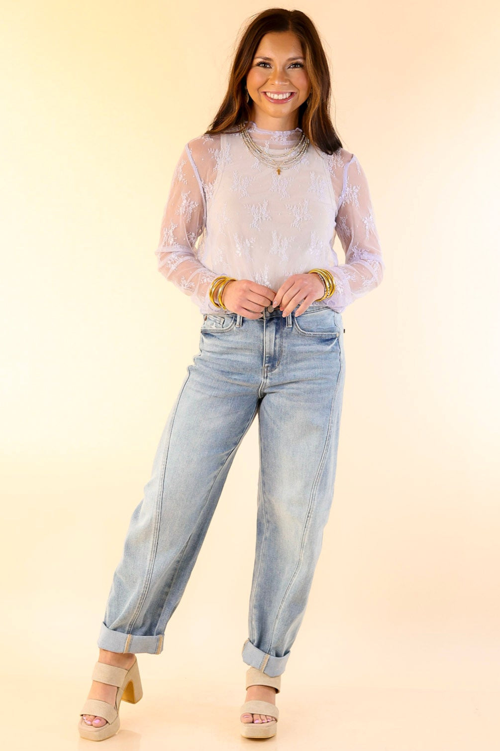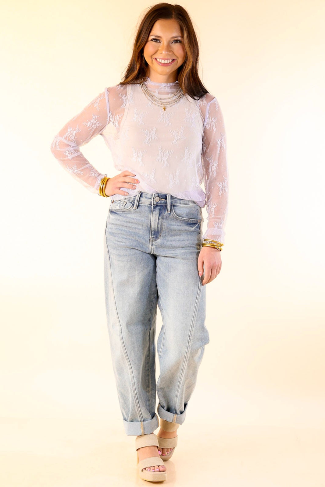 The Delicate Charm top is a feminine essential for any wardrobe. Featuring long sleeves and a sophisticated mock neck, this top is designed with a sheer lace pattern for a soft, romantic look. Perfect for layering or wearing on its own, this top pairs beautifully with denim, skirts, or layered under jackets for a chic touch. Whether you're dressing it up for a night out or keeping it casual, the Delicate Charm top offers timeless elegance and versatility.