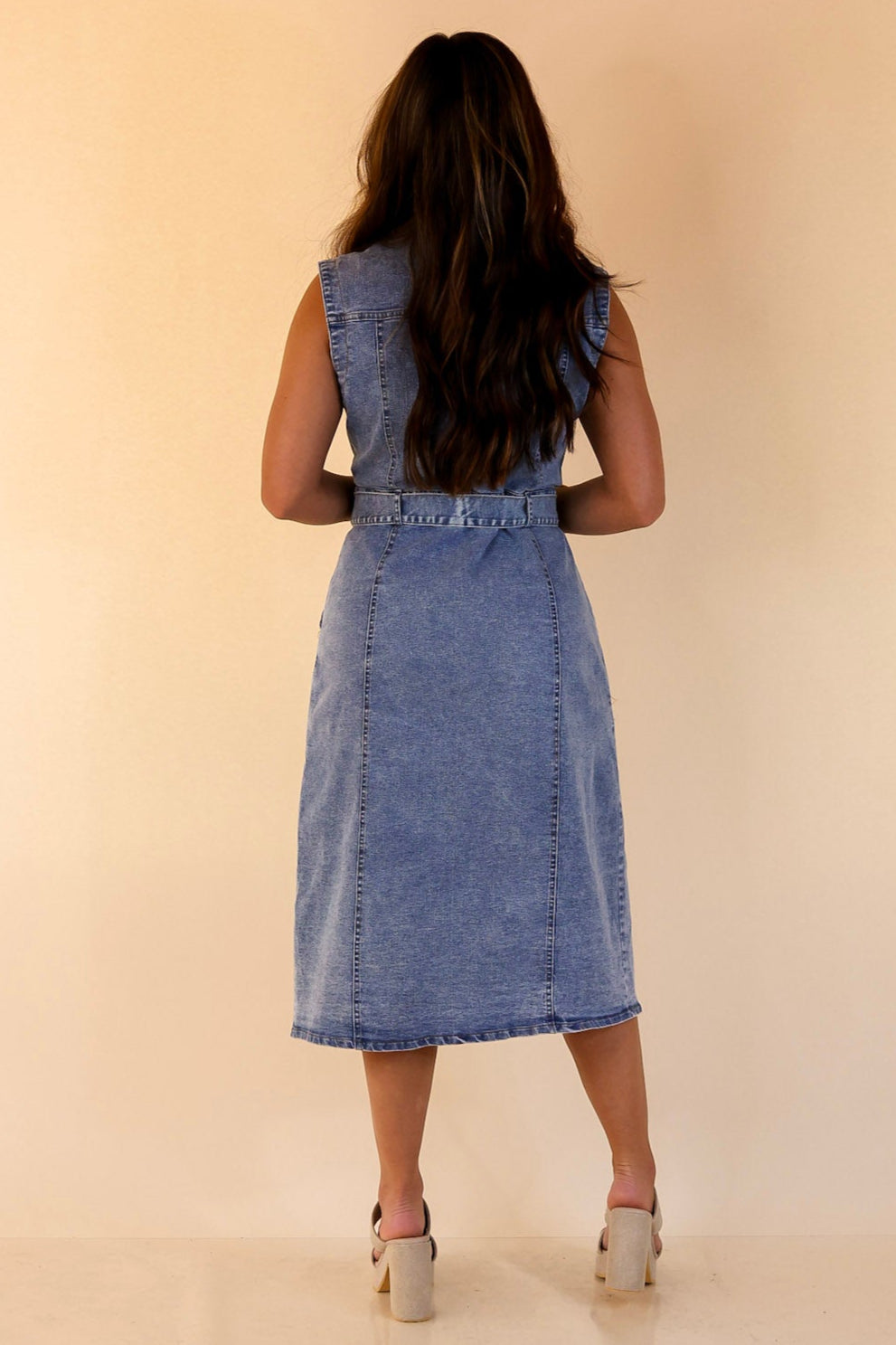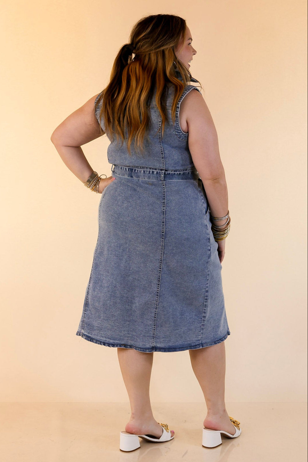 Effortless, flattering, and made for wherever the day takes you. This sleeveless medium wash denim dress features a classic button-down front, a removable belt to cinch the waist, and functional front pockets for that easygoing vibe. The collared neckline adds just the right amount of structure, while the soft denim keeps things comfy from morning errands to dinner plans. Style it with sneakers for a casual day out or dress it up with wedges and bold accessories—this one’s ready for it all.