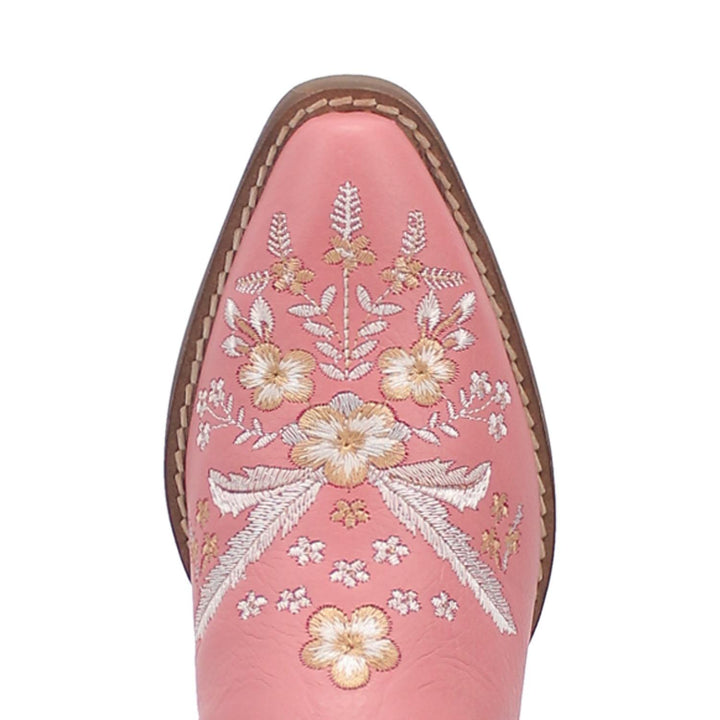 A pink bootie with a white and cream floral and feather design on the upper, a white and cream stitched design on the edge, and a short heel.