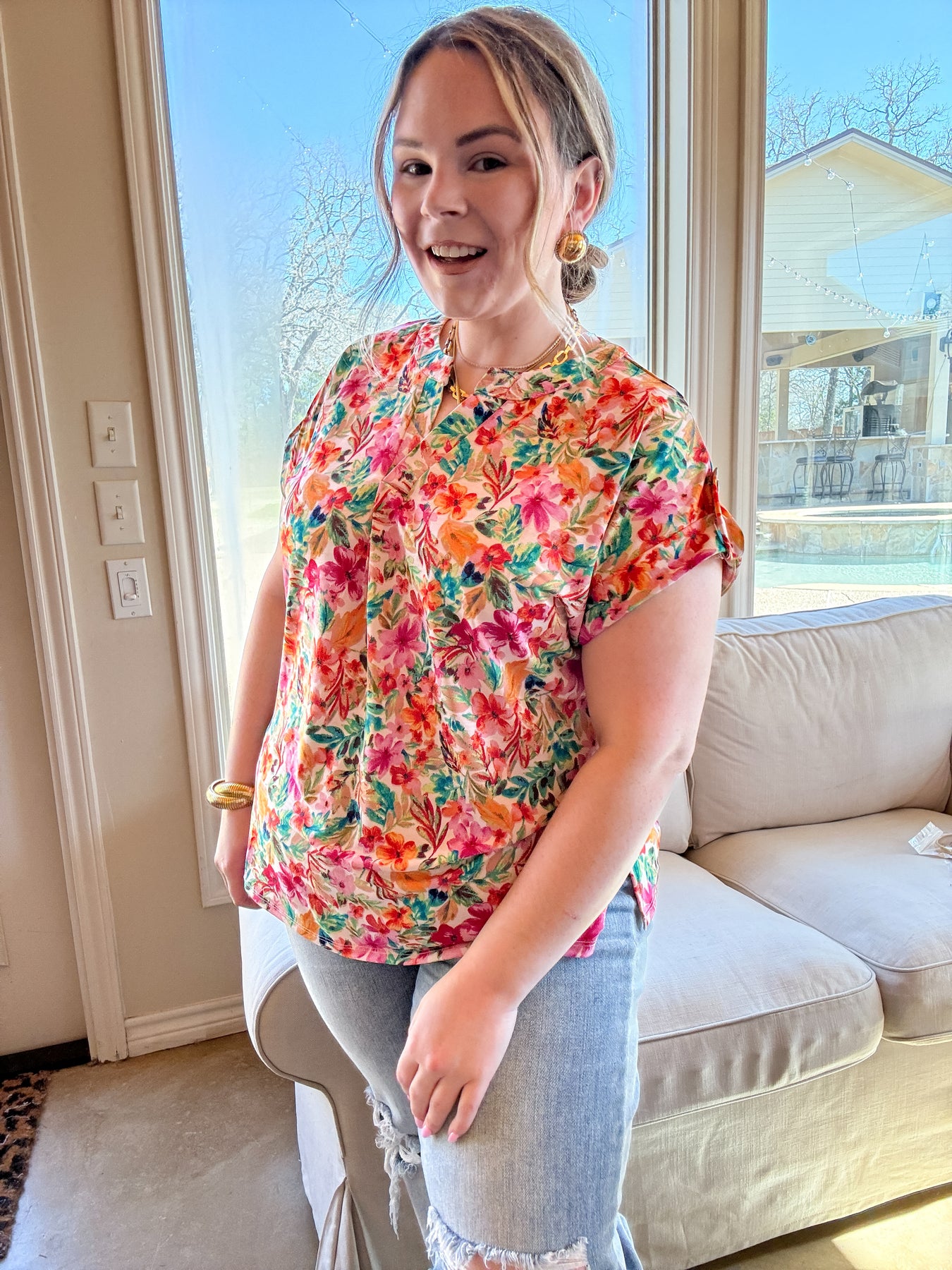 Downtown Darling Floral Print Short Sleeve Tunic Top in Pink Mix