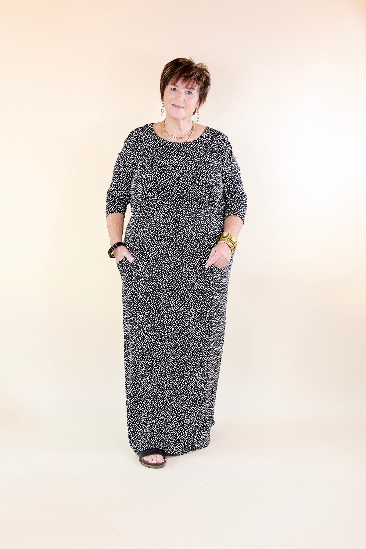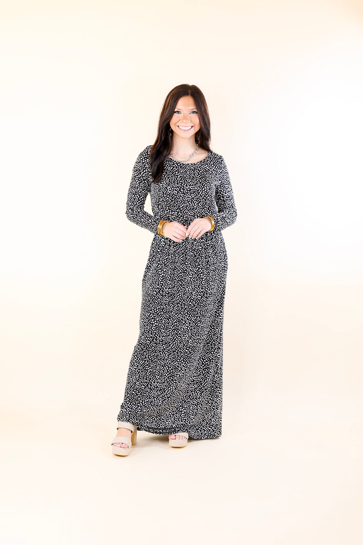Downtown Spotlight Long Sleeve Dotted Babydoll Maxi Dress in Black