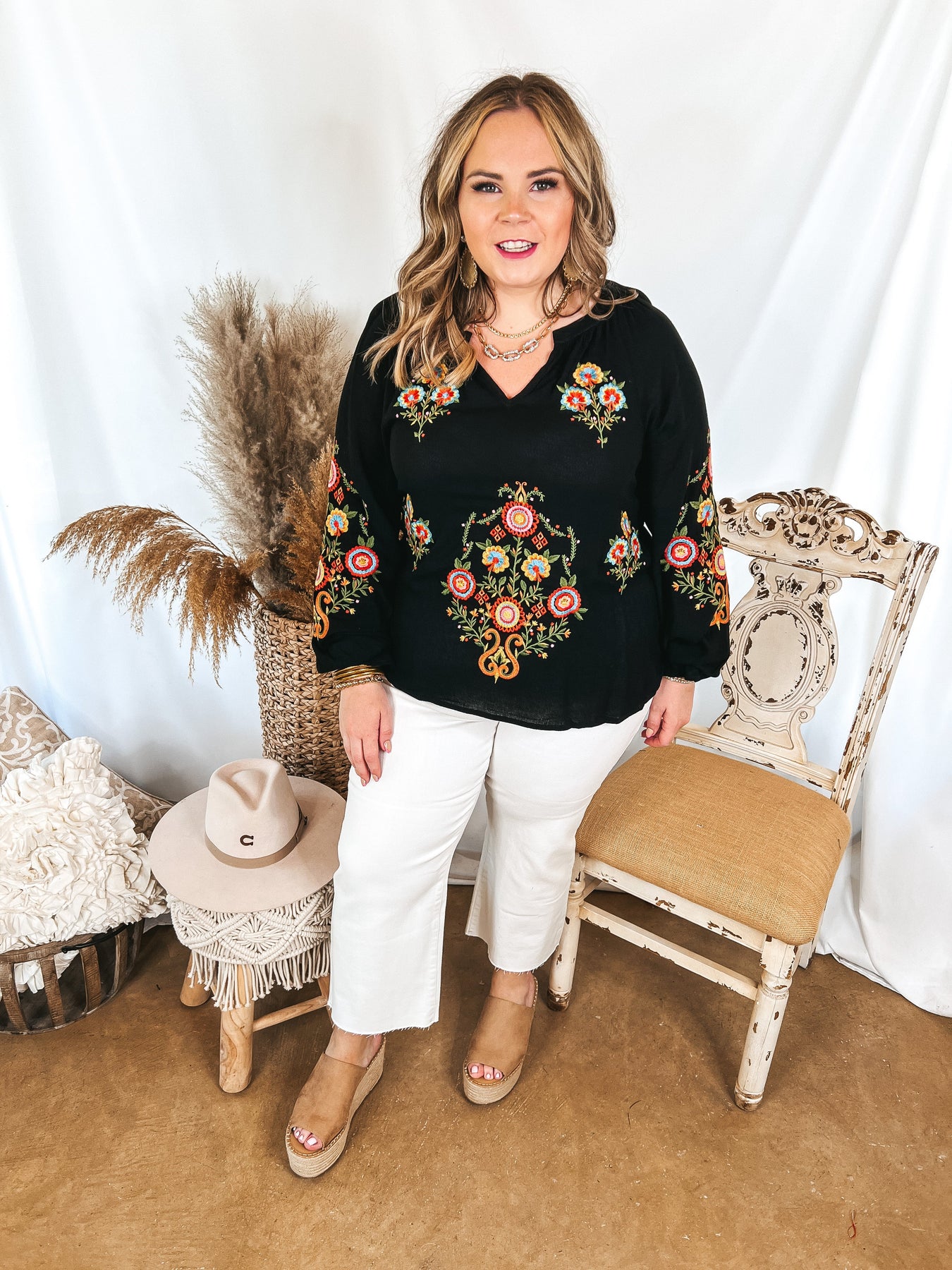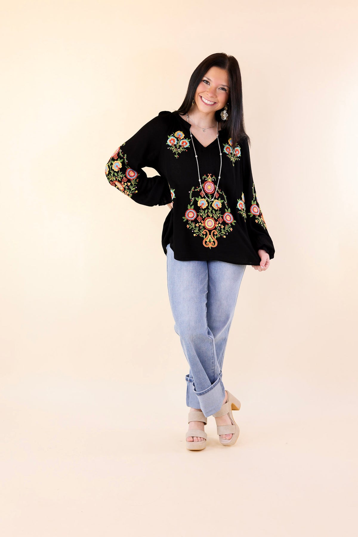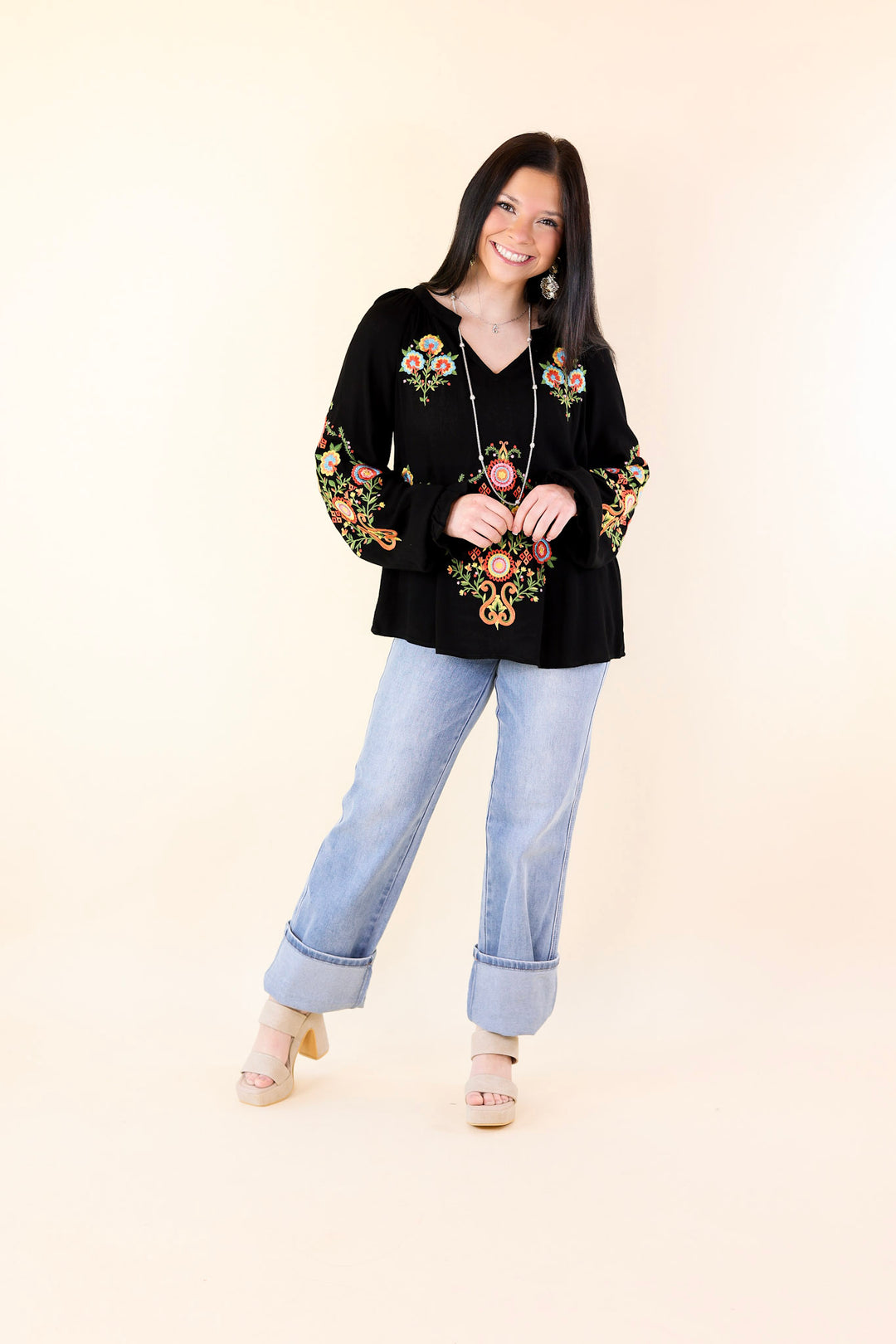 This top will make you look dreamy at any destination! It includes long sleeves, a notched v neckline, and colorful embroidery on the front of the top and on the sleeves. Pair it with slacks for a day at the office, or shorts for a fun look!