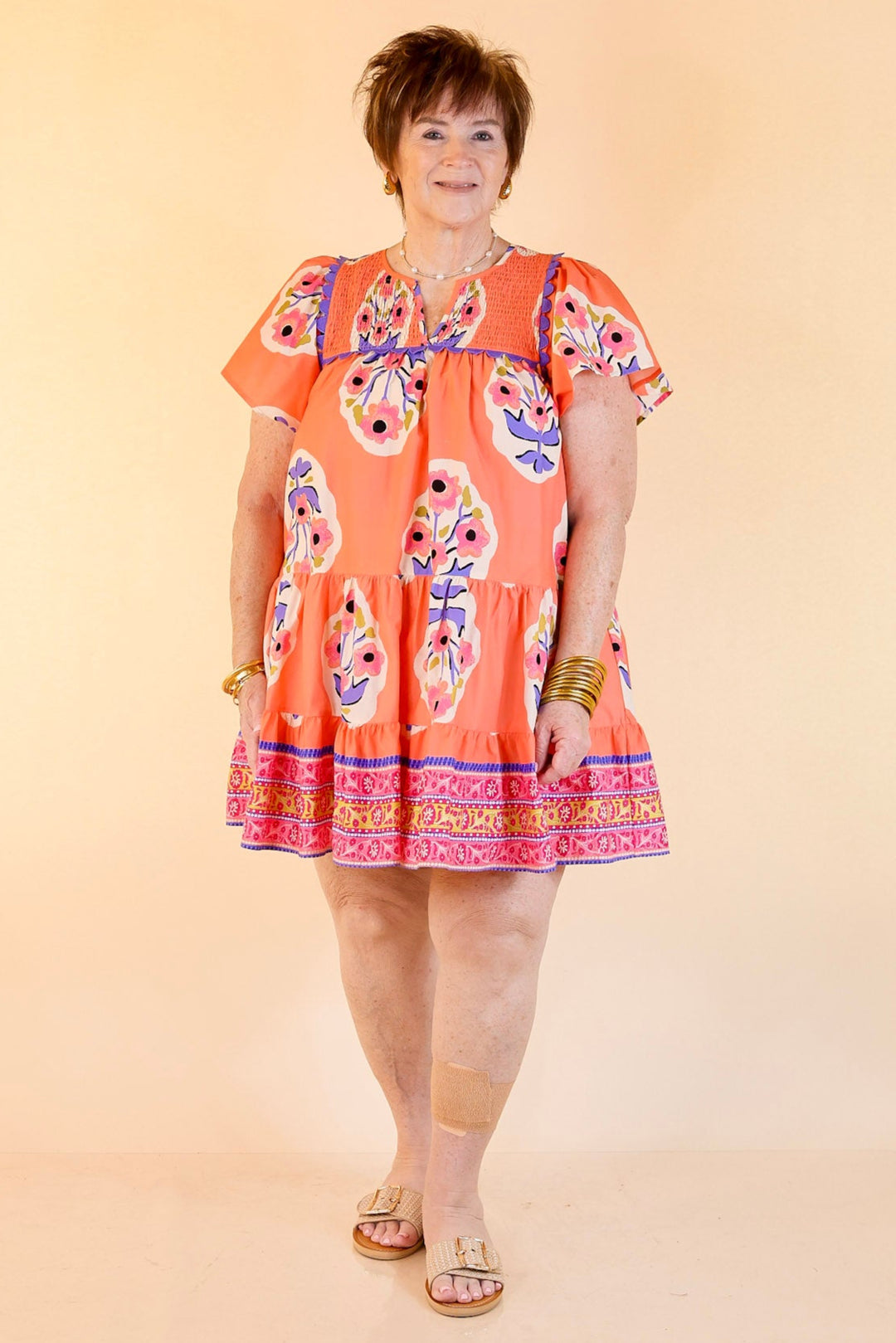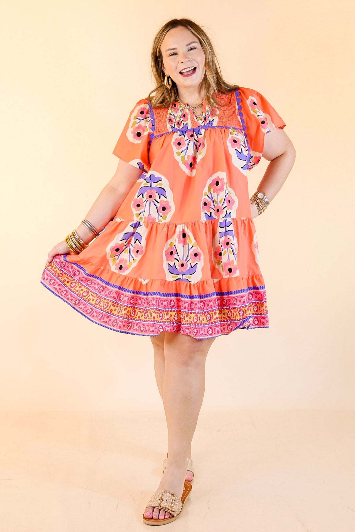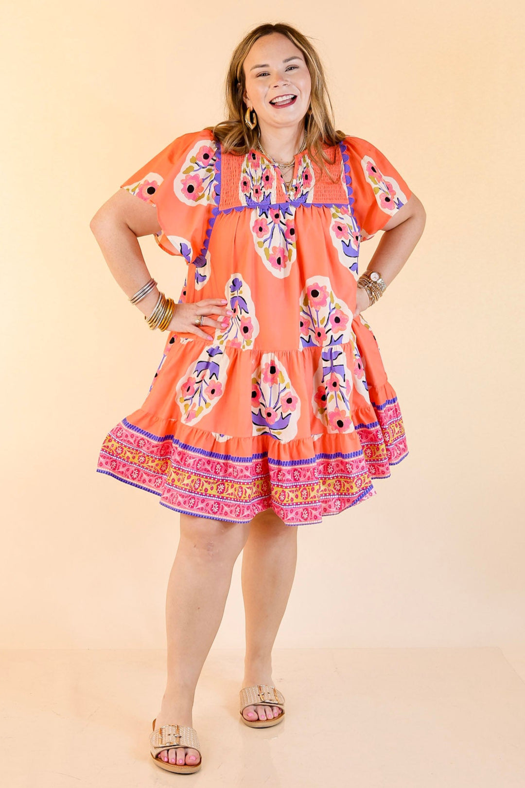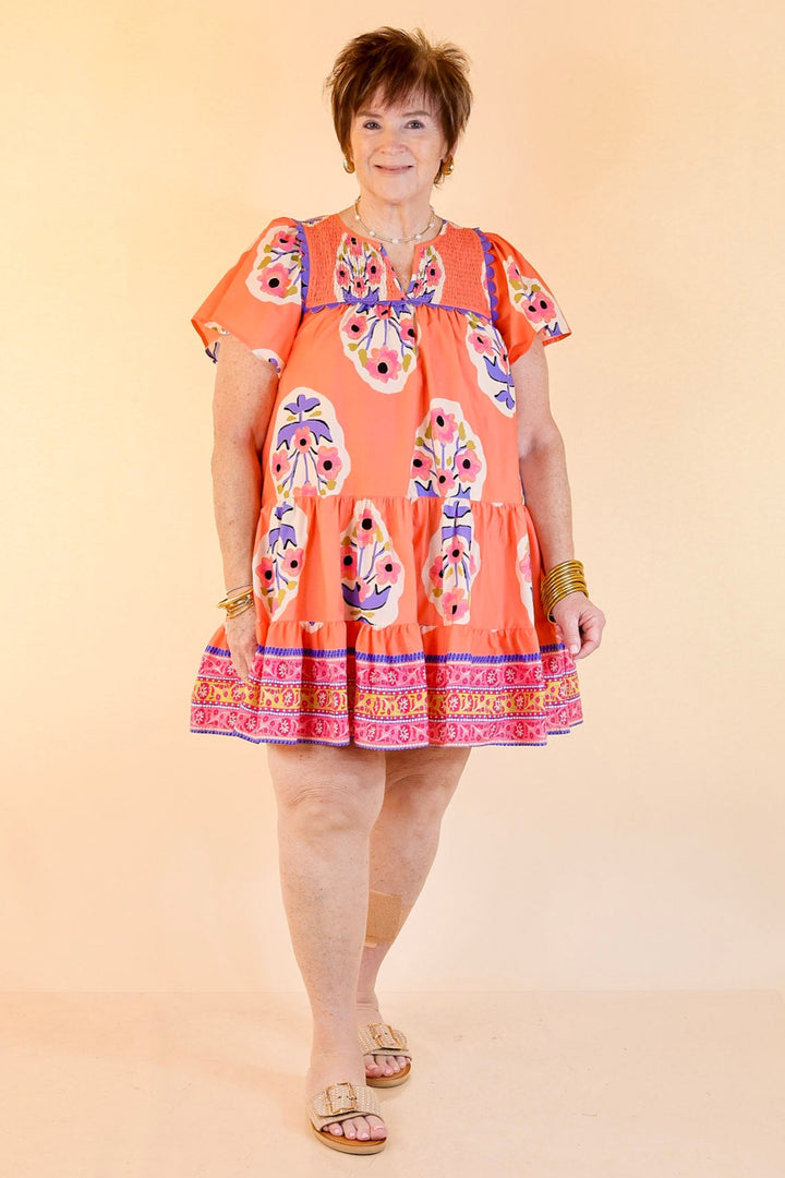 Bright, playful, and made to stand out. The Floral Crush dress features a coral base with a vibrant floral pattern and a pop of purple rickrack trim along the neckline. A V-neck and just a touch of smocking at the front bodice add flattering detail, while the easy silhouette makes it perfect for warm-weather days.
