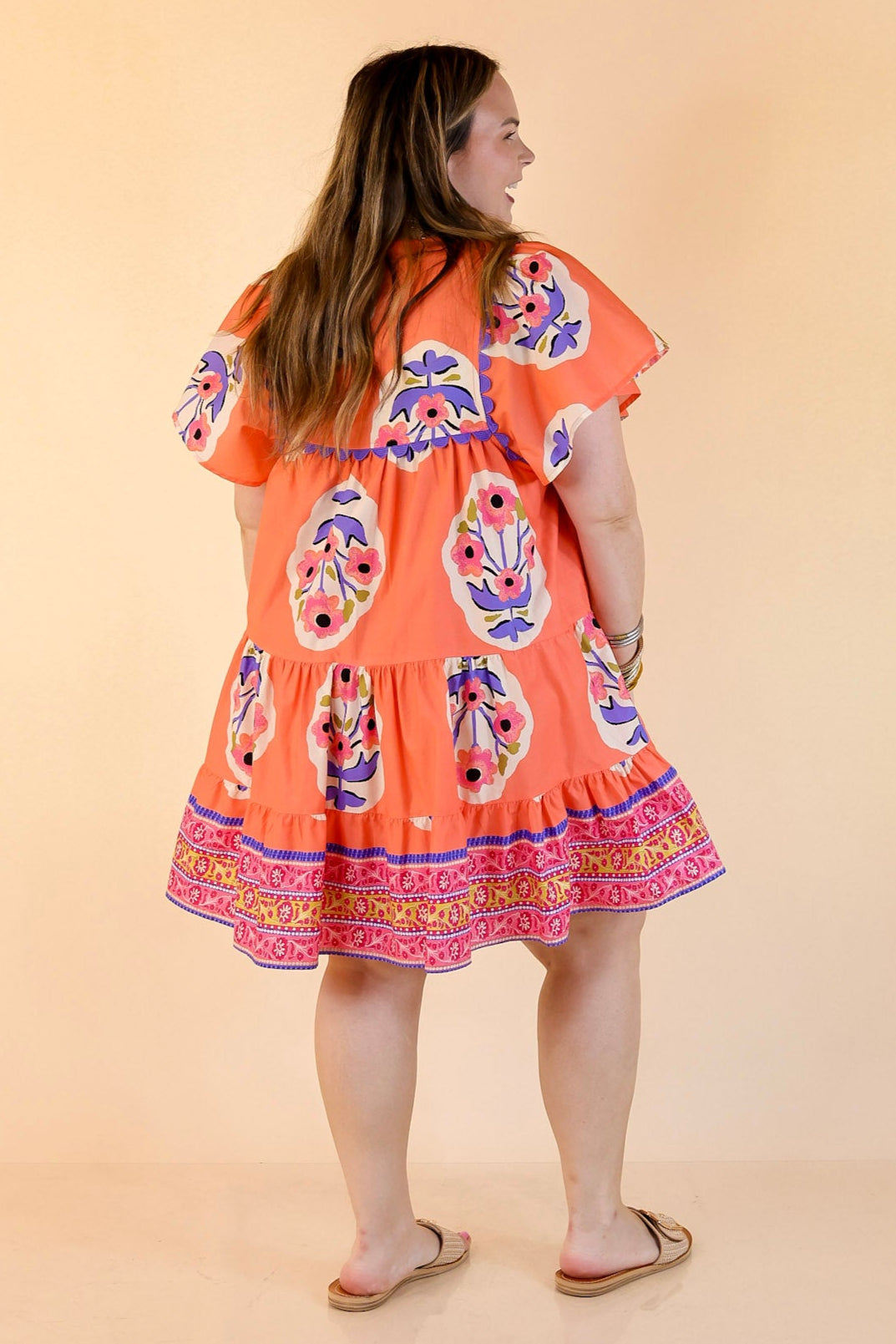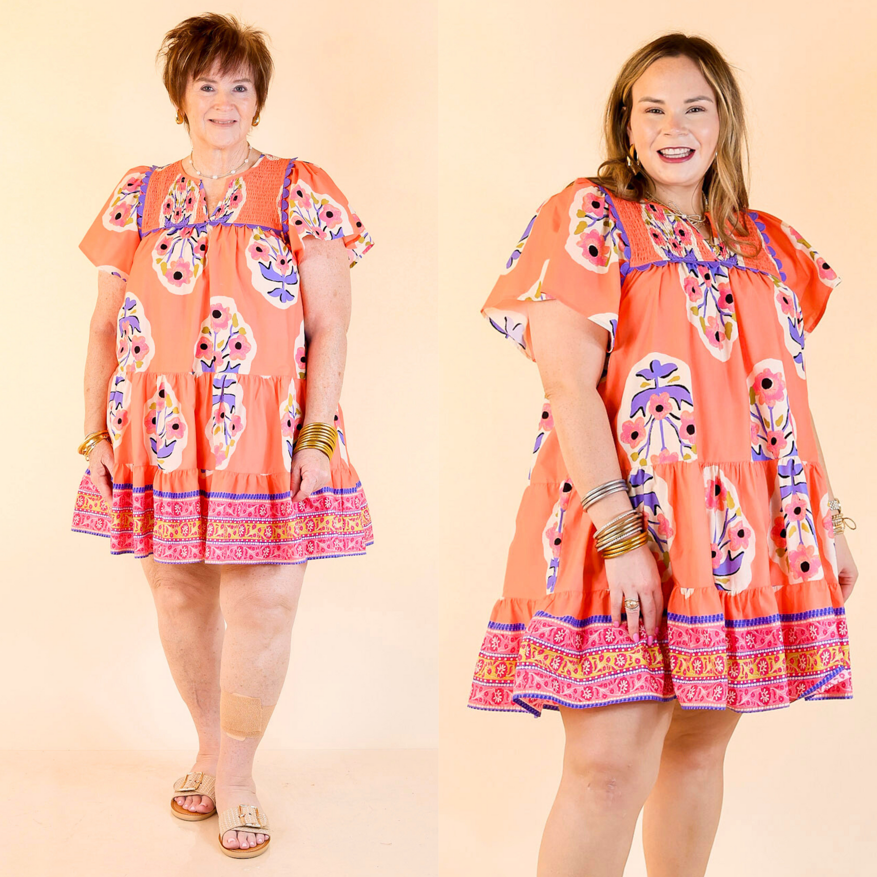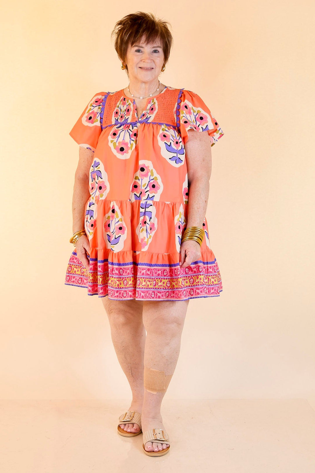 Bright, playful, and made to stand out. The Floral Crush dress features a coral base with a vibrant floral pattern and a pop of purple rickrack trim along the neckline. A V-neck and just a touch of smocking at the front bodice add flattering detail, while the easy silhouette makes it perfect for warm-weather days.