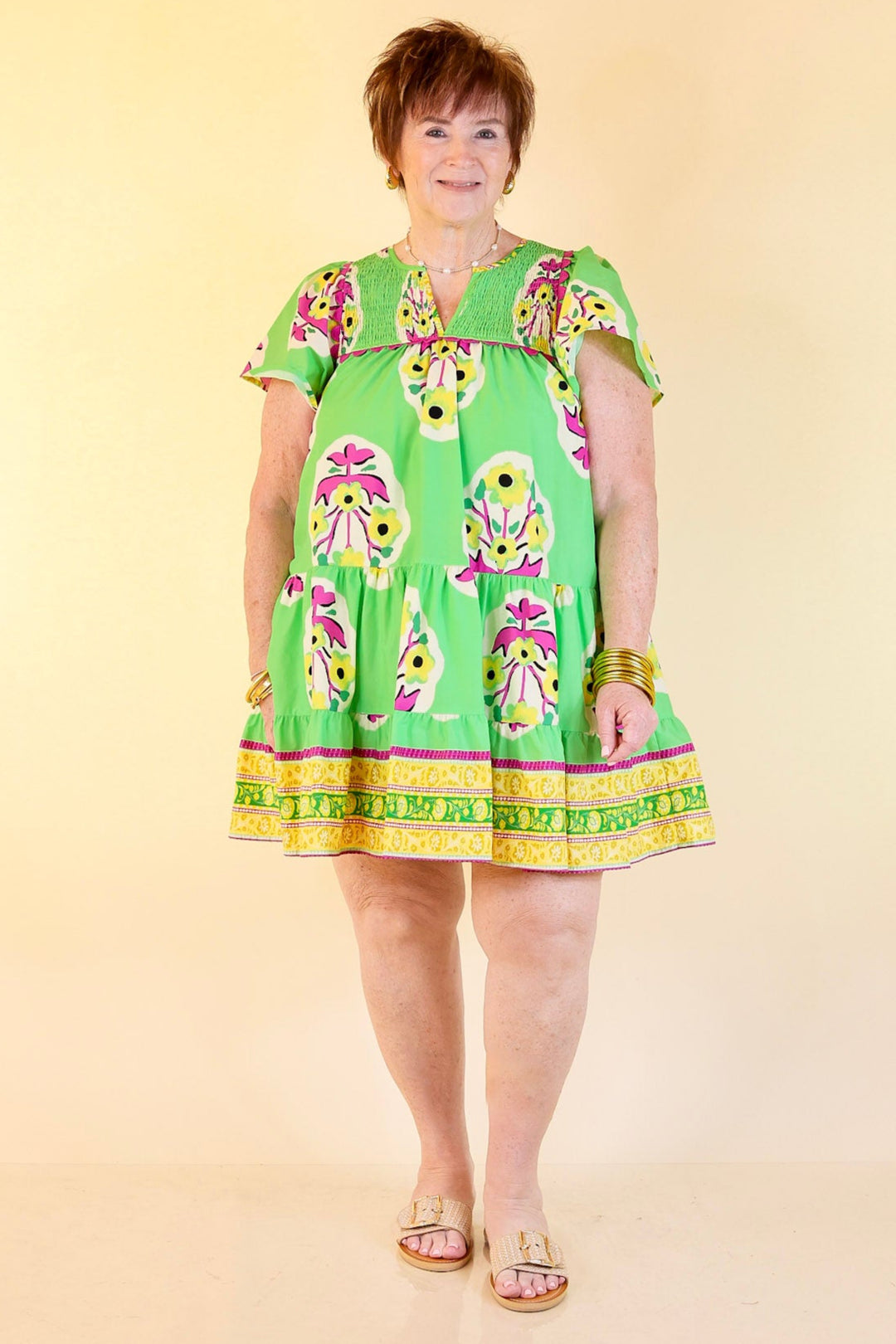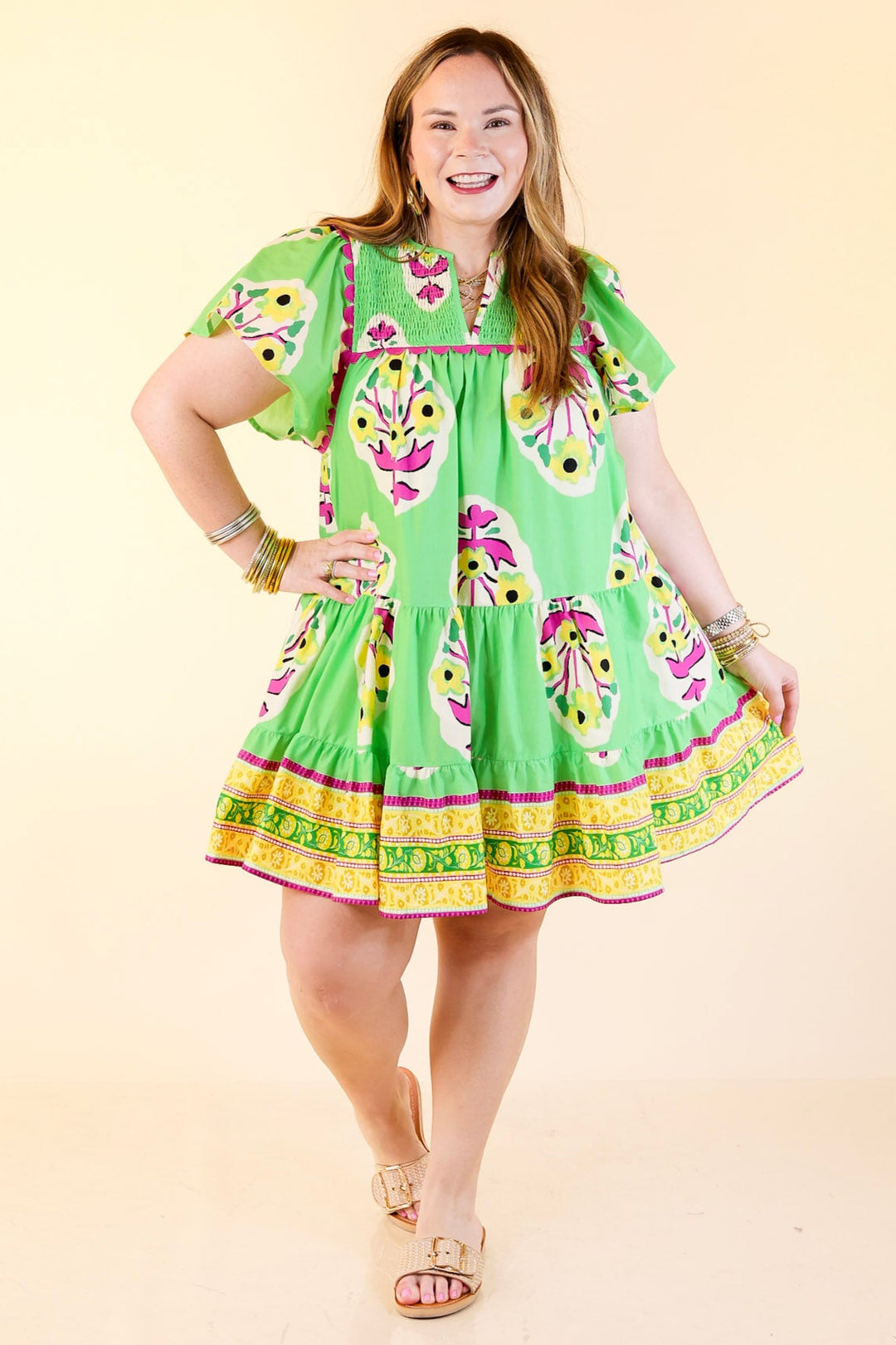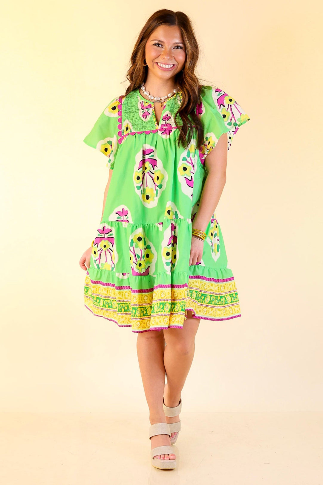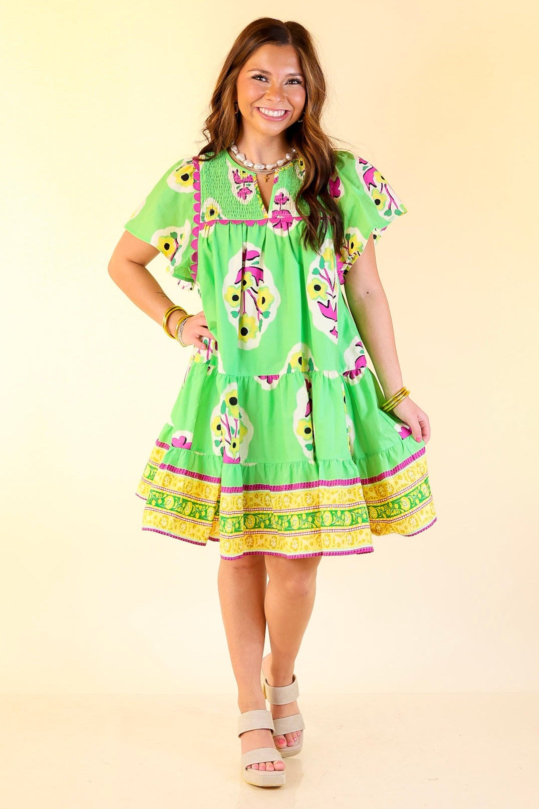 Bright, playful, and made to stand out. The Floral Crush dress features a green base with a vibrant floral pattern and a pop of purple rickrack trim along the neckline. A V-neck and just a touch of smocking at the front bodice add flattering detail, while the easy silhouette makes it perfect for warm-weather days.