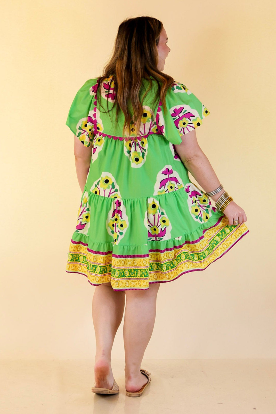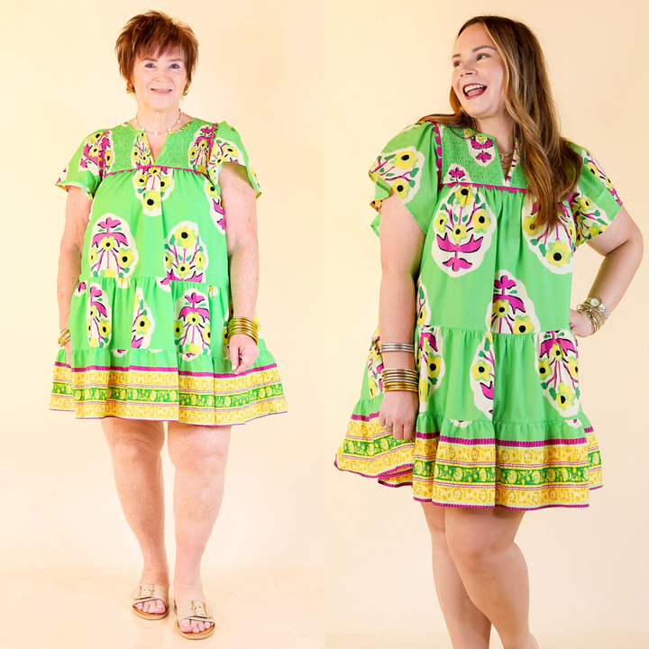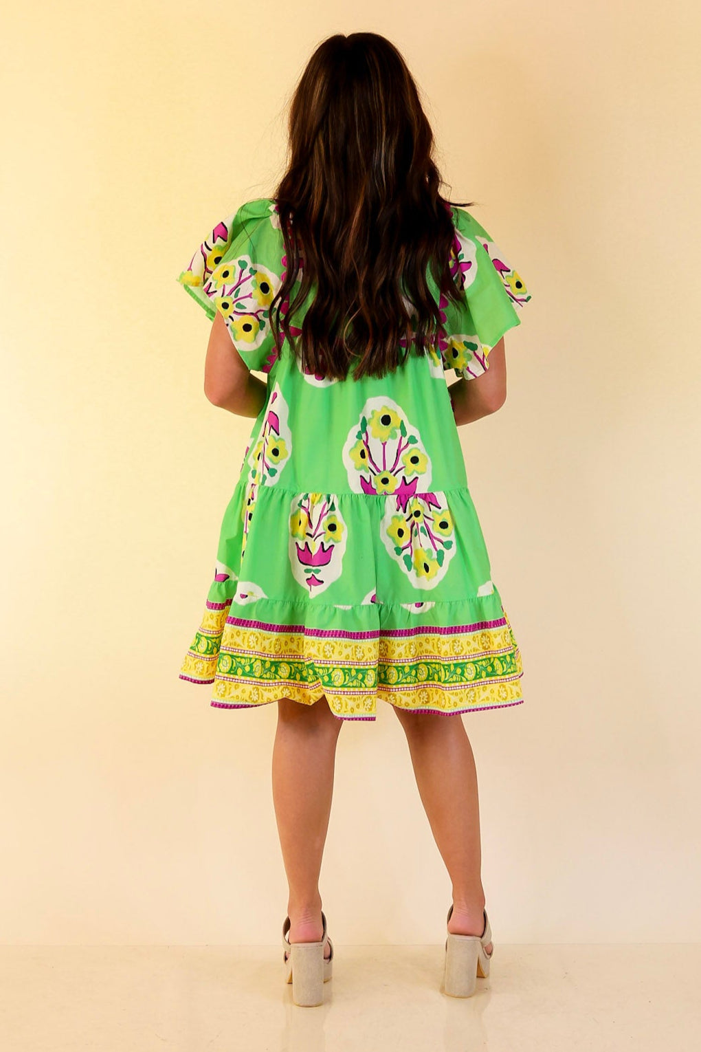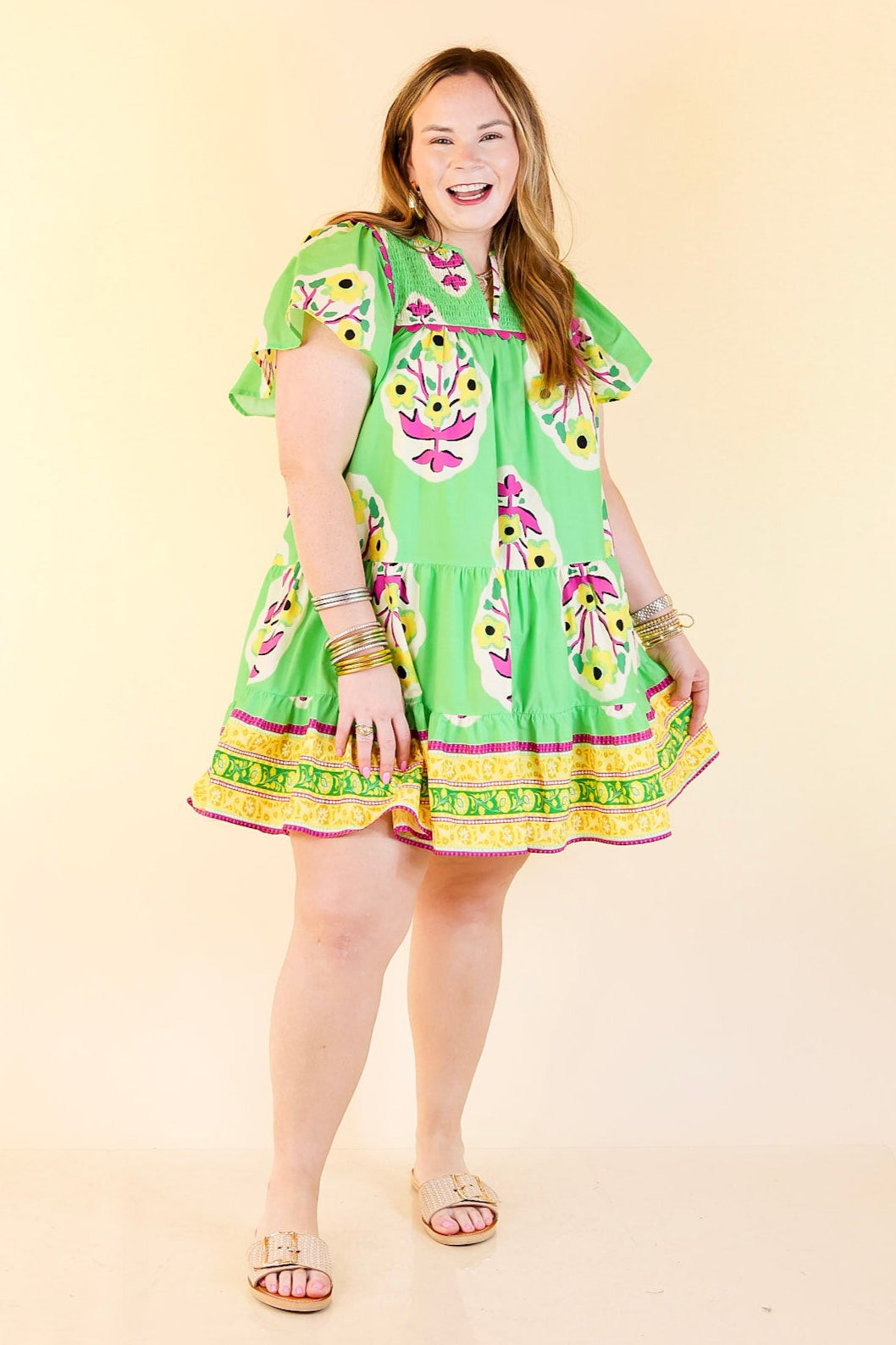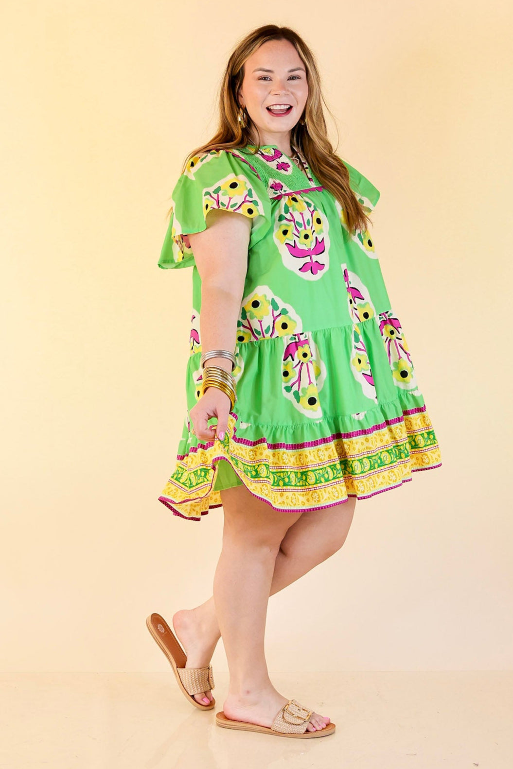 Bright, playful, and made to stand out. The Floral Crush dress features a green base with a vibrant floral pattern and a pop of purple rickrack trim along the neckline. A V-neck and just a touch of smocking at the front bodice add flattering detail, while the easy silhouette makes it perfect for warm-weather days.