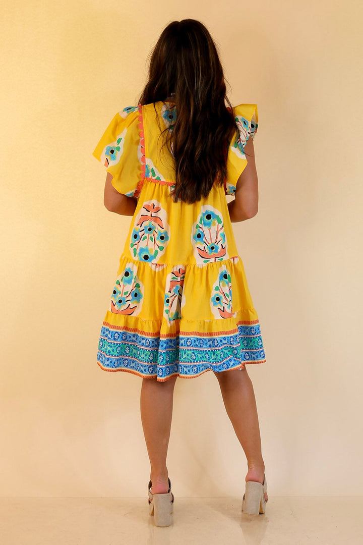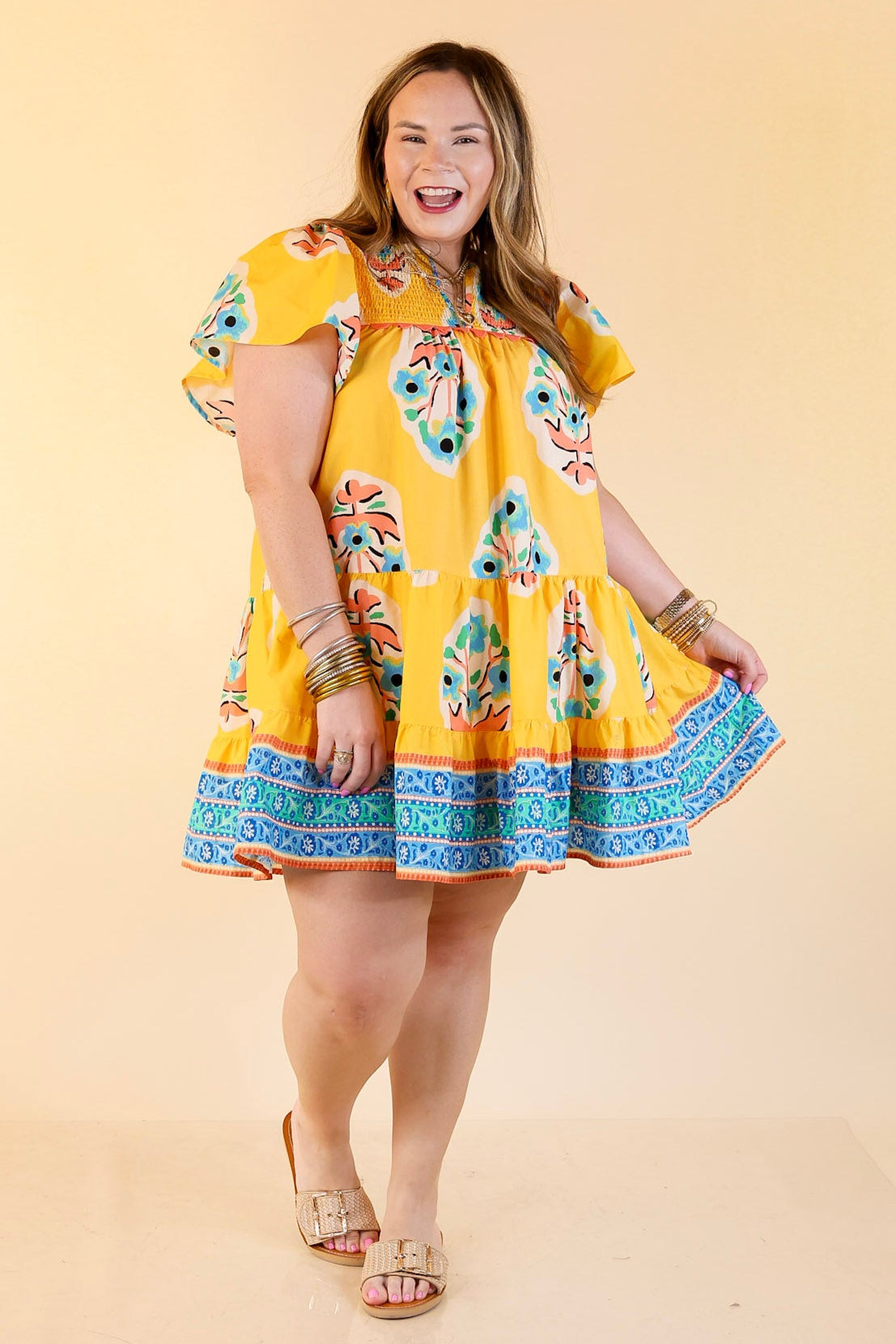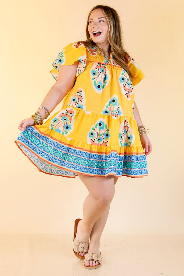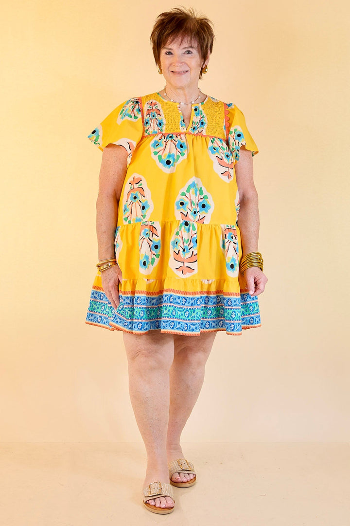 Bright, playful, and made to stand out. The Floral Crush dress features a yellow base with a vibrant floral pattern and a pop of coral rickrack trim along the neckline. A V-neck and just a touch of smocking at the front bodice add flattering detail, while the easy silhouette makes it perfect for warm-weather days.
