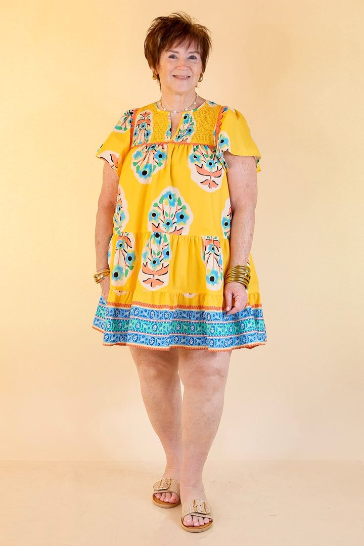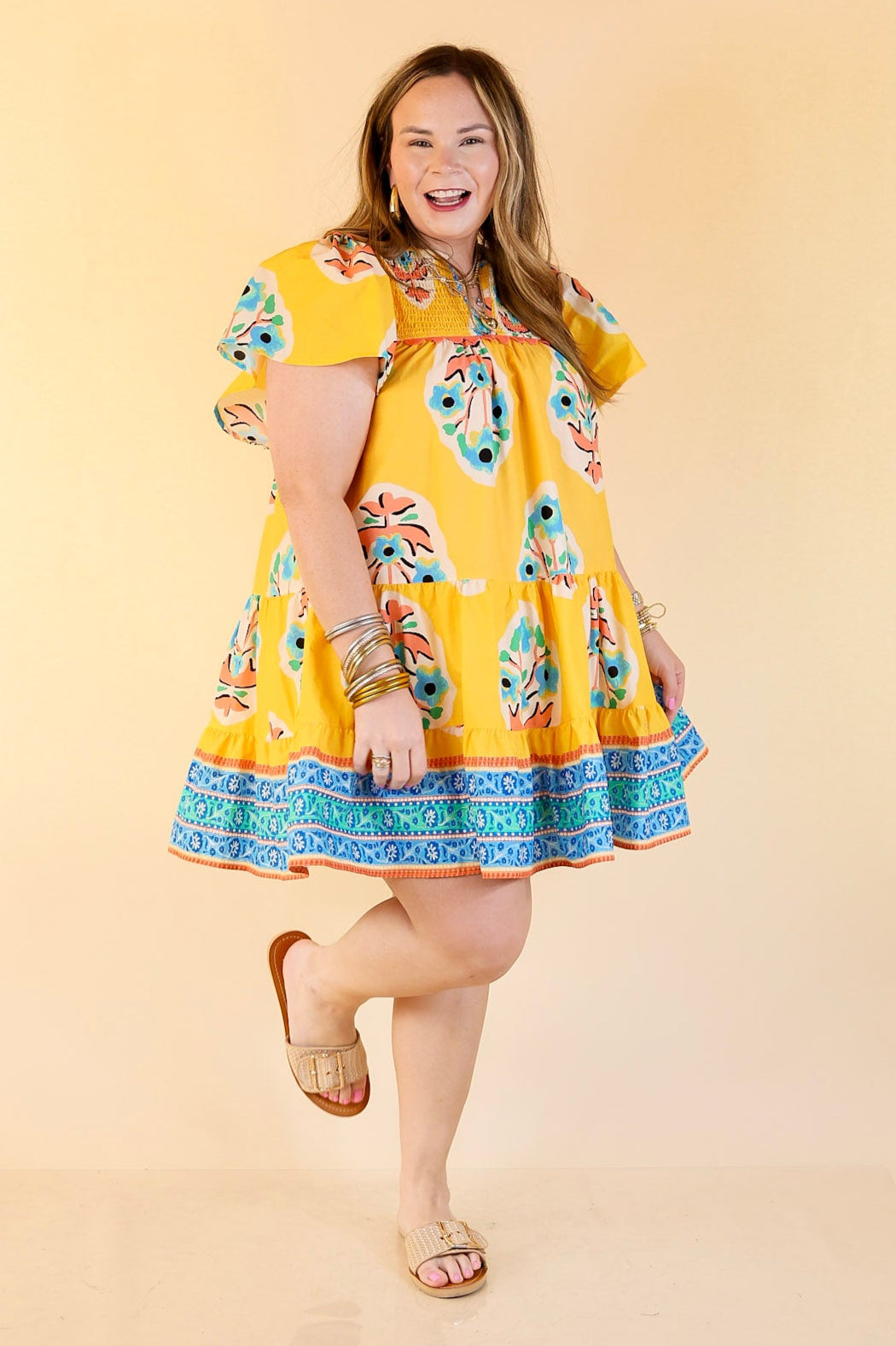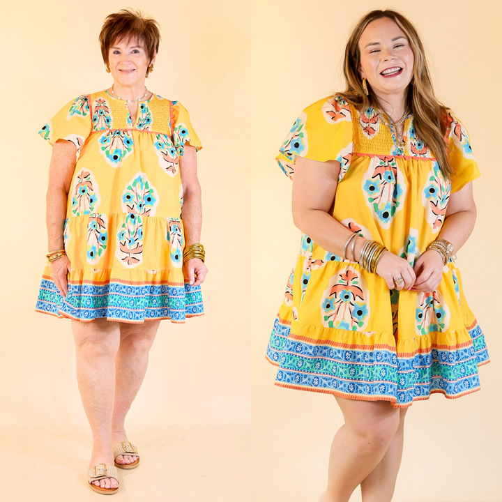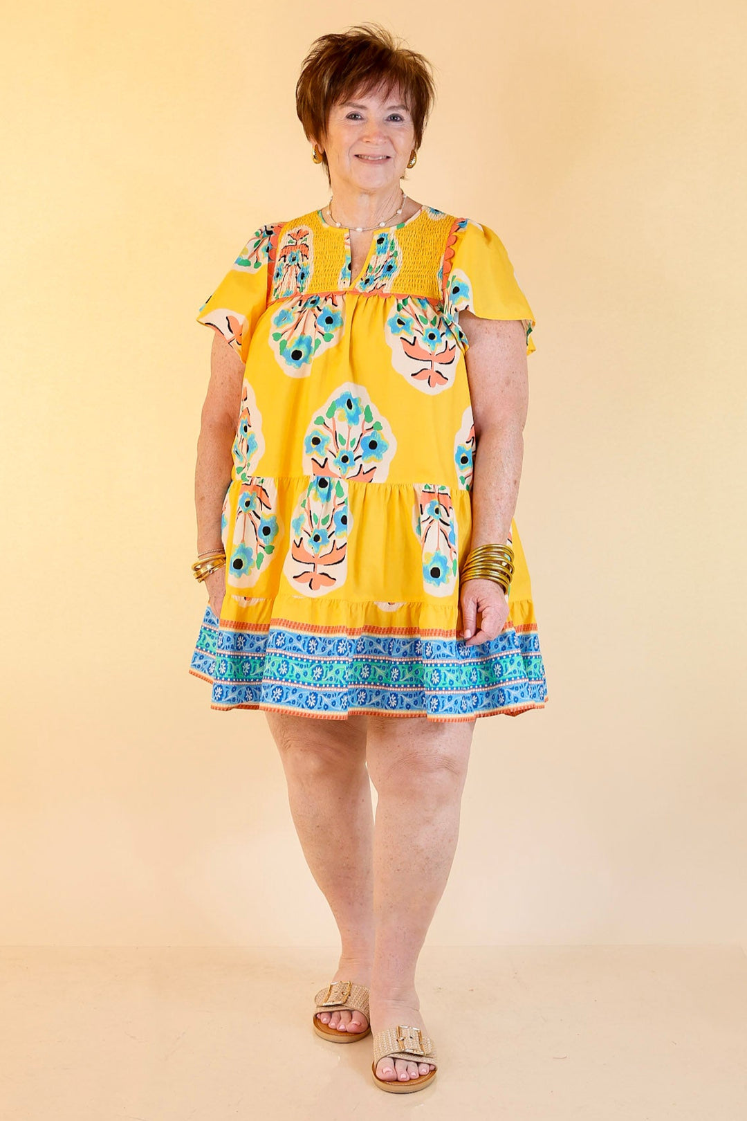 Floral Crush Dress with Coral Rickrack Trim and Partial Smocked Bodice in Yellow