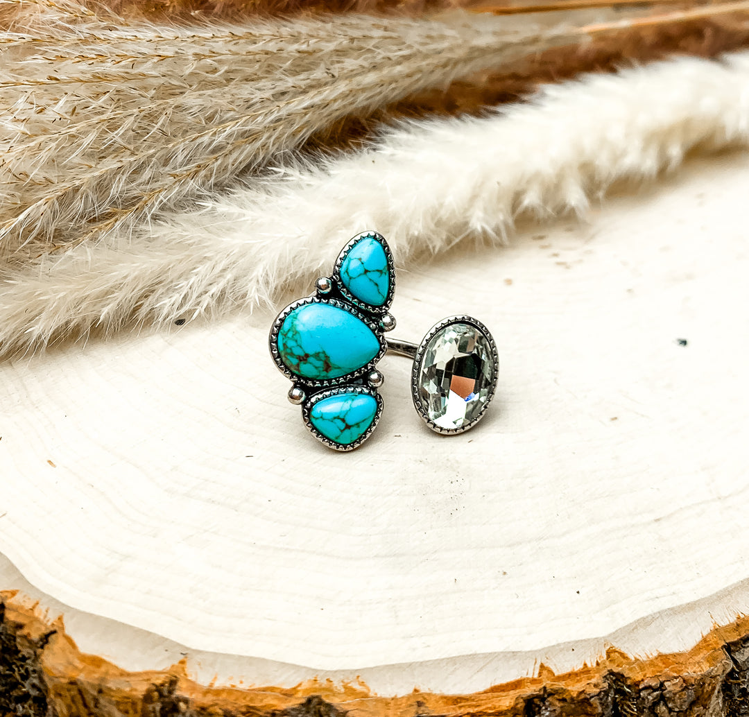 Duo Finger Ring With Multiple Turquoise Blue Stones and a Clear Crystal