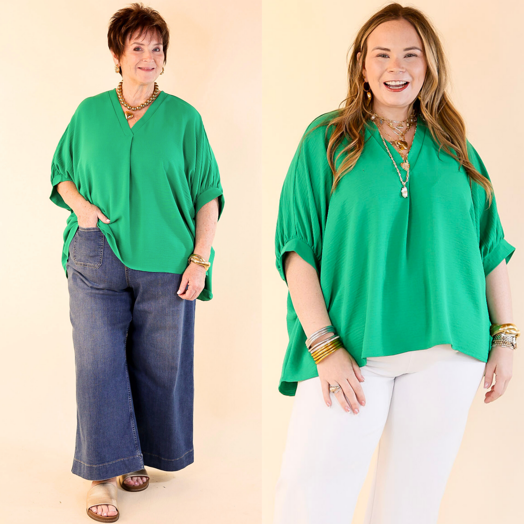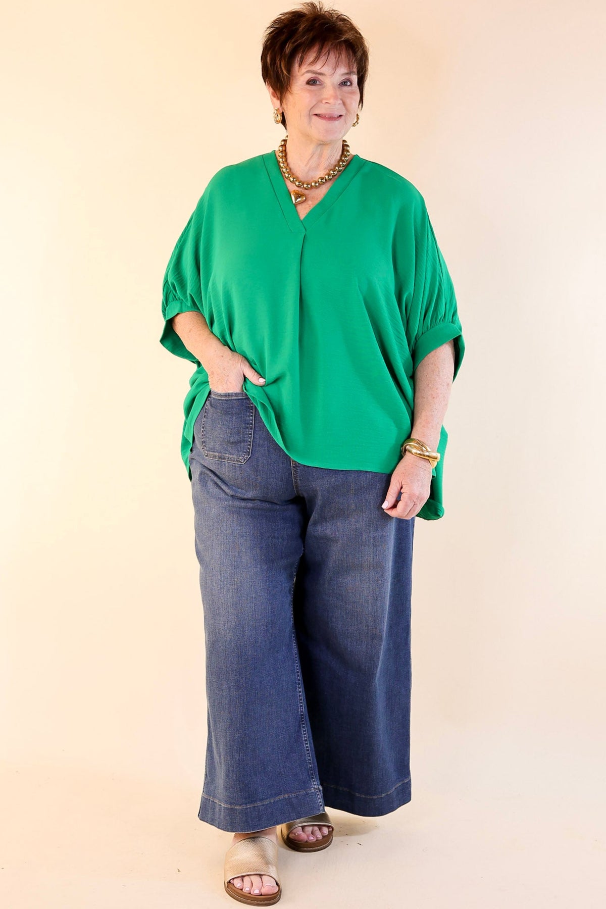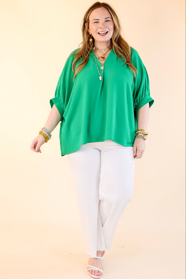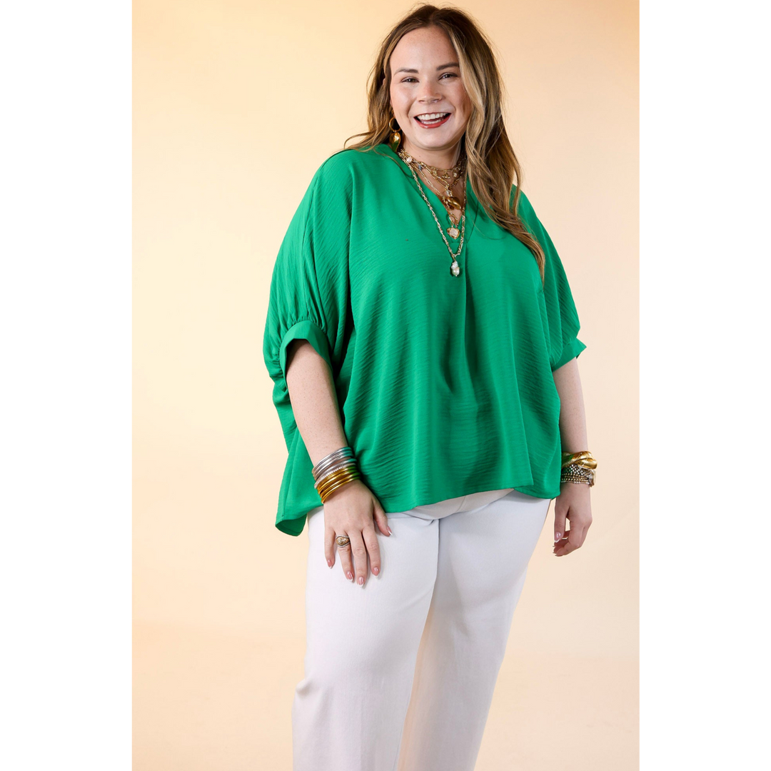 Elevated Basics V Neck Top with Half Sleeves in Kelly Green