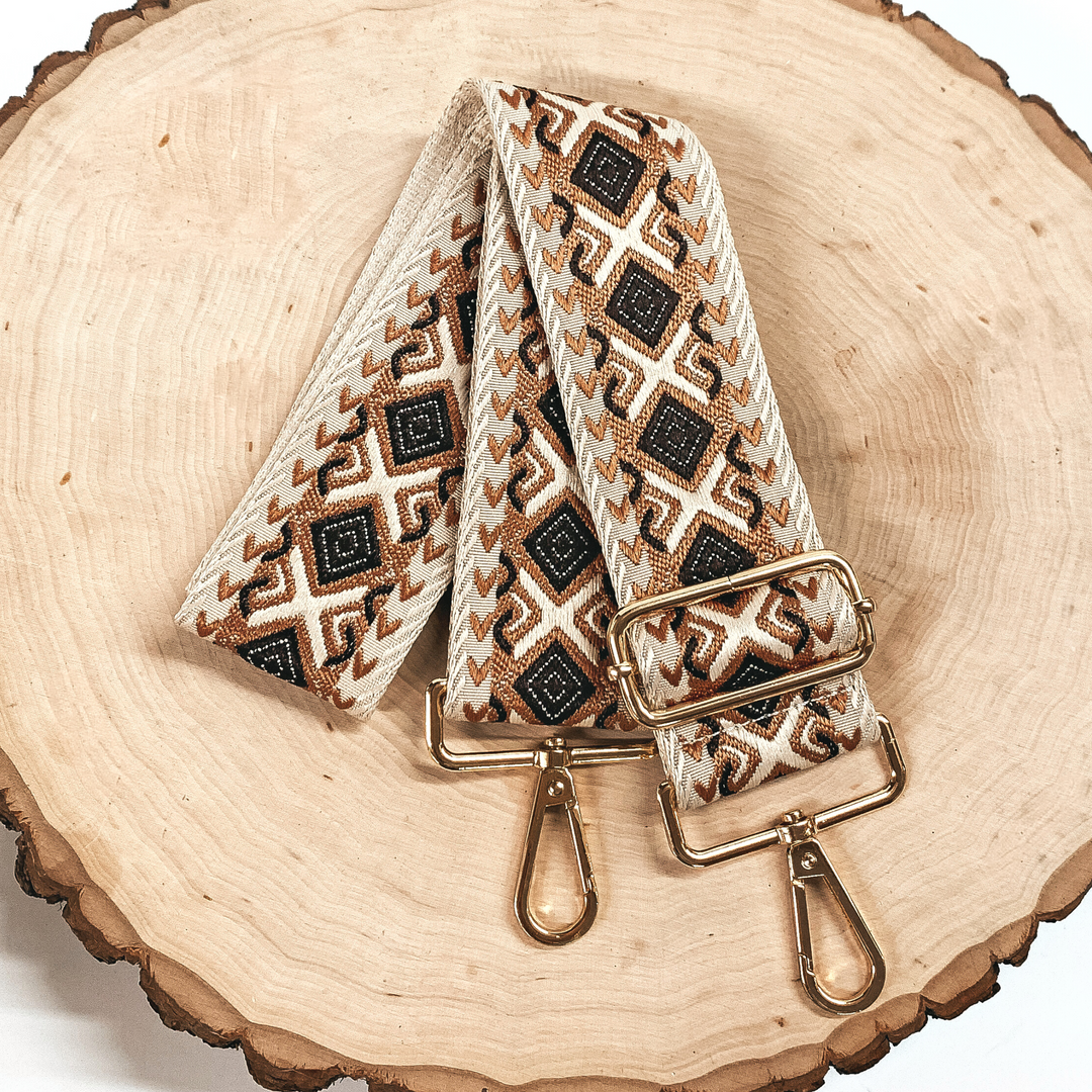 Embroidered Aztec Design Adjustable Purse Strap in Beige and Tan Mix