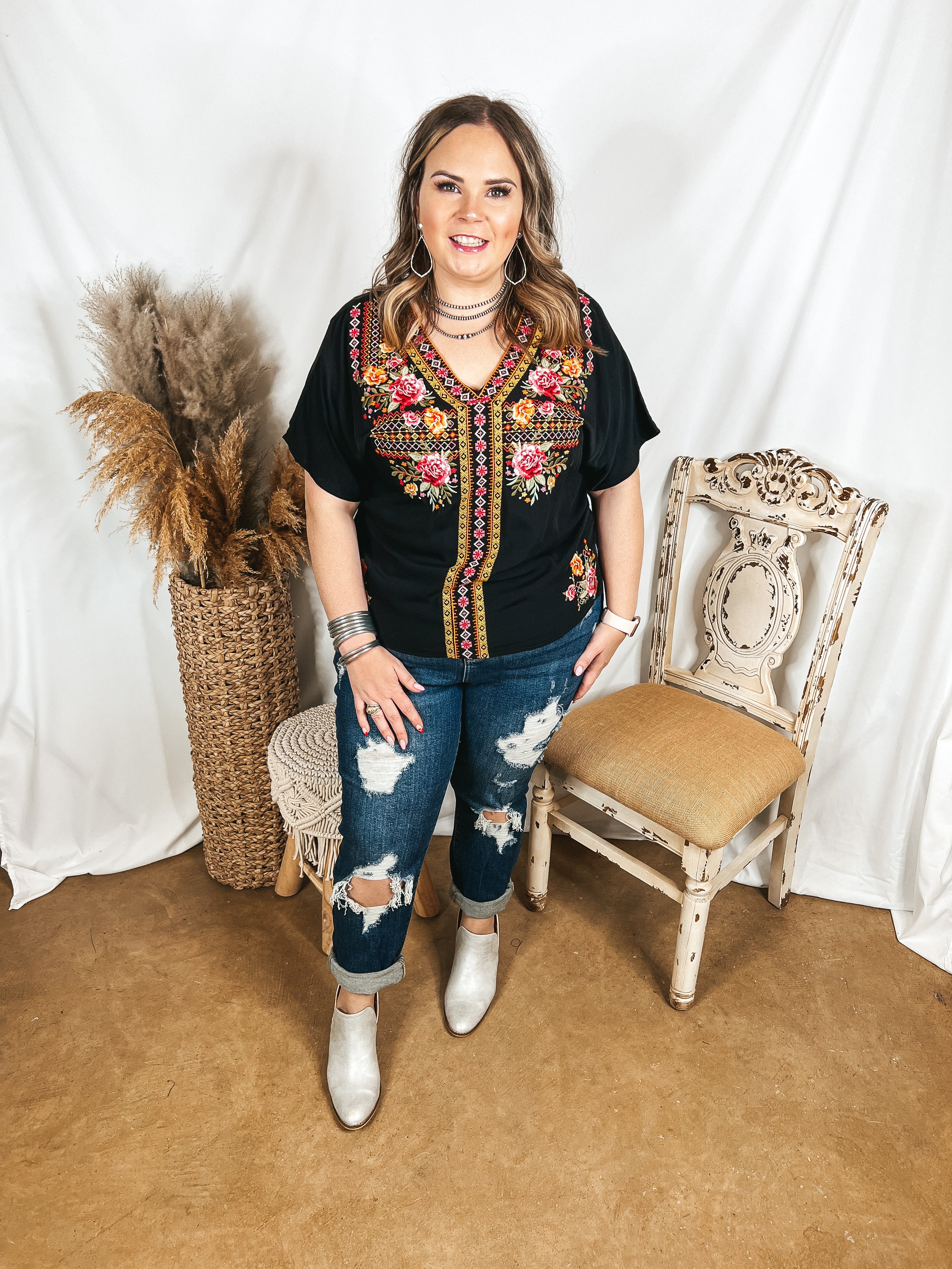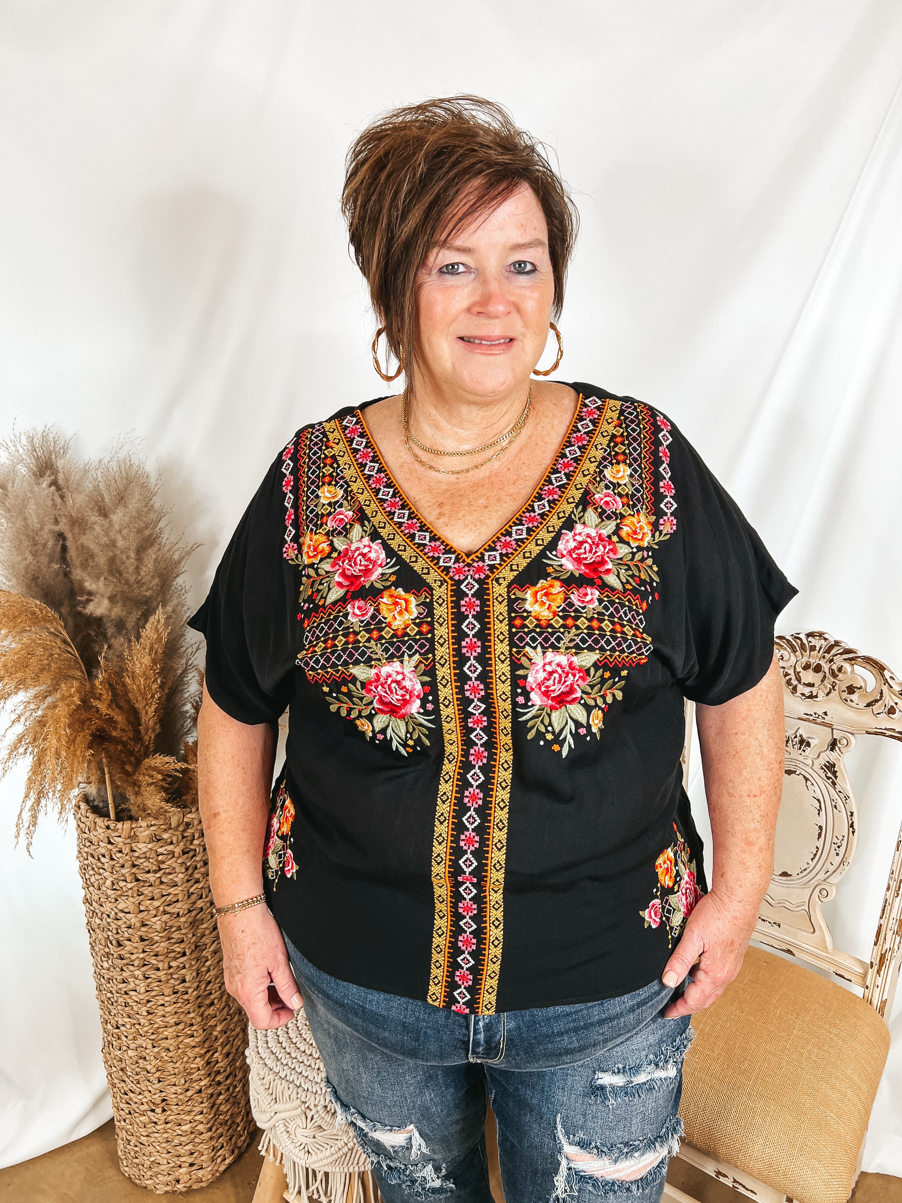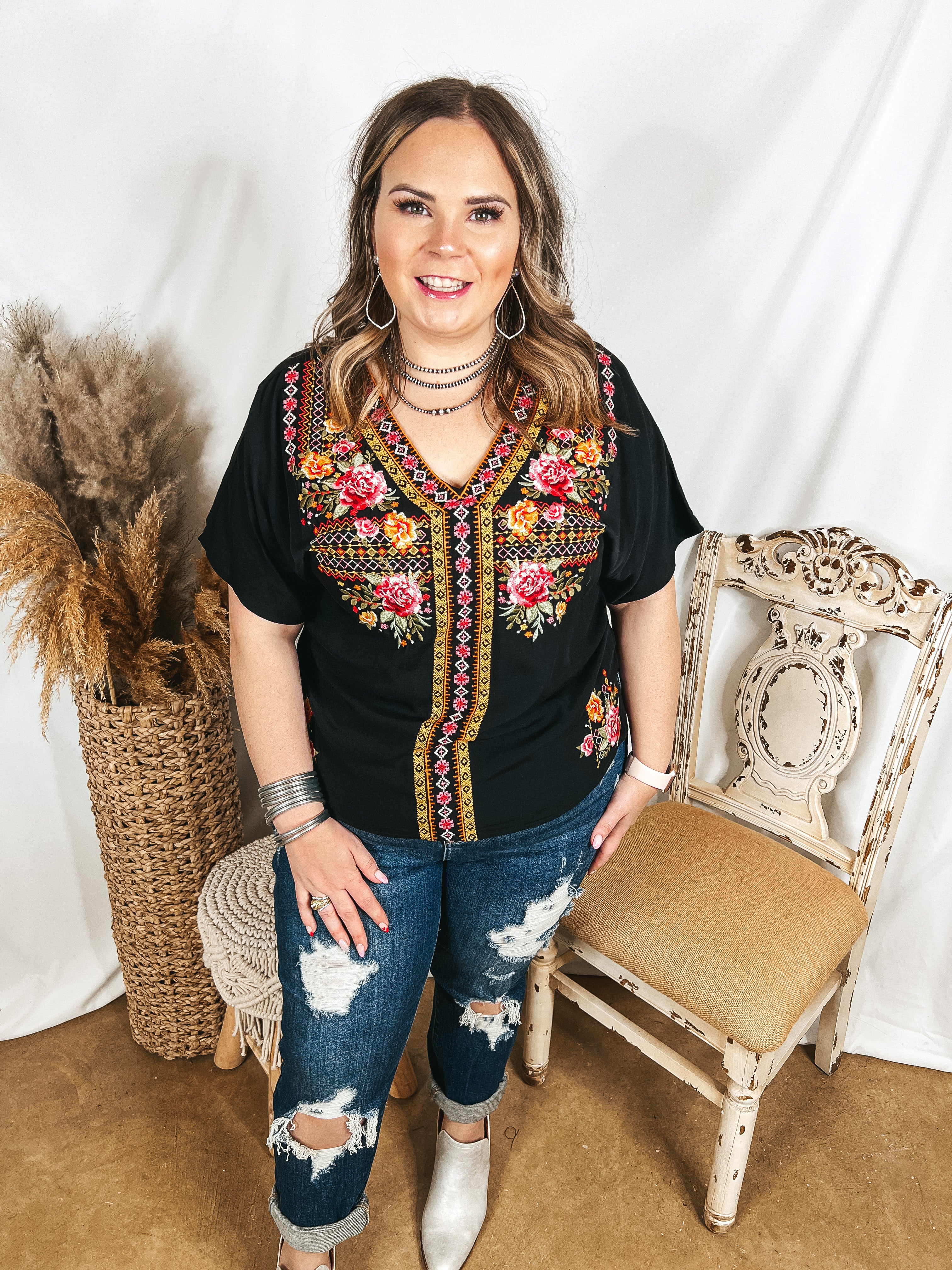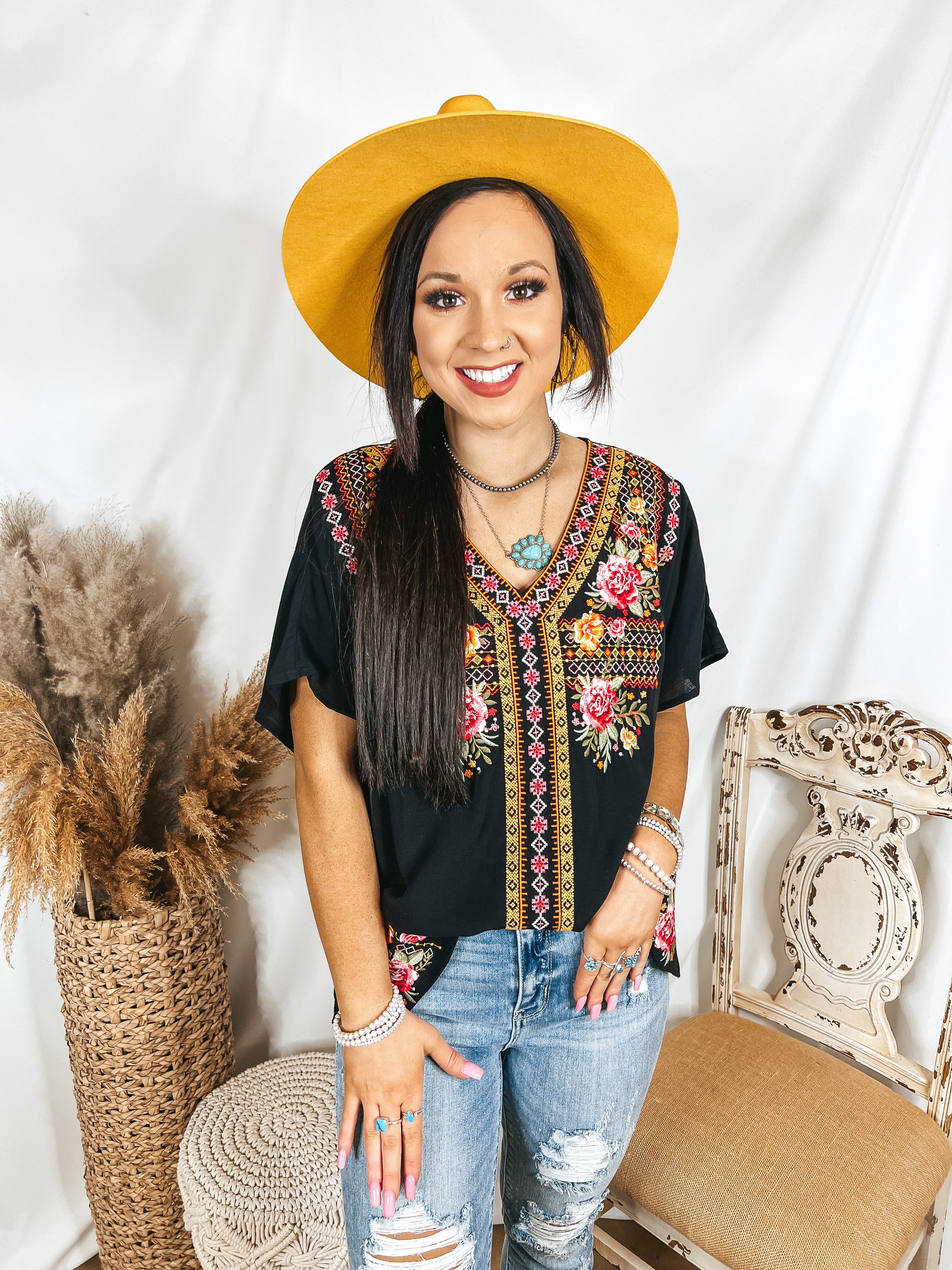 Last Chance Size Small, Medium, 1XL | Time in Terlingua Southwest Embroidered Short Sleeve V Neck Top in Black