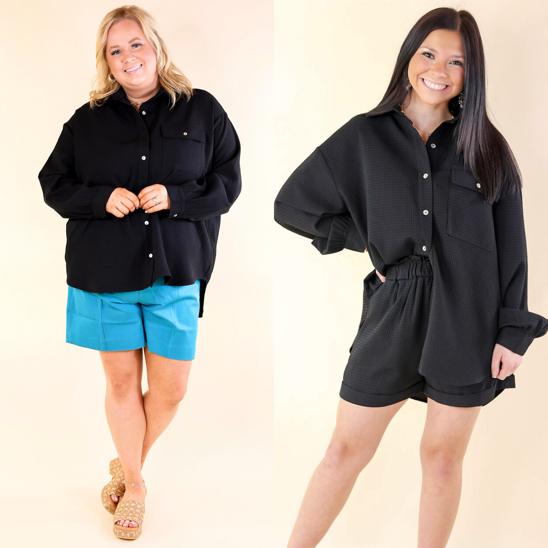 Our Escaping Ordinary Waffle Weave Button Up Top is made from a lightweight fabric with a unique waffle weave texture. This top is perfect for the cooler seasons with its collared neckline, chest pocket, and long sleeves. Button up for a clean and structured look. Make sure to grab the matching shorts!