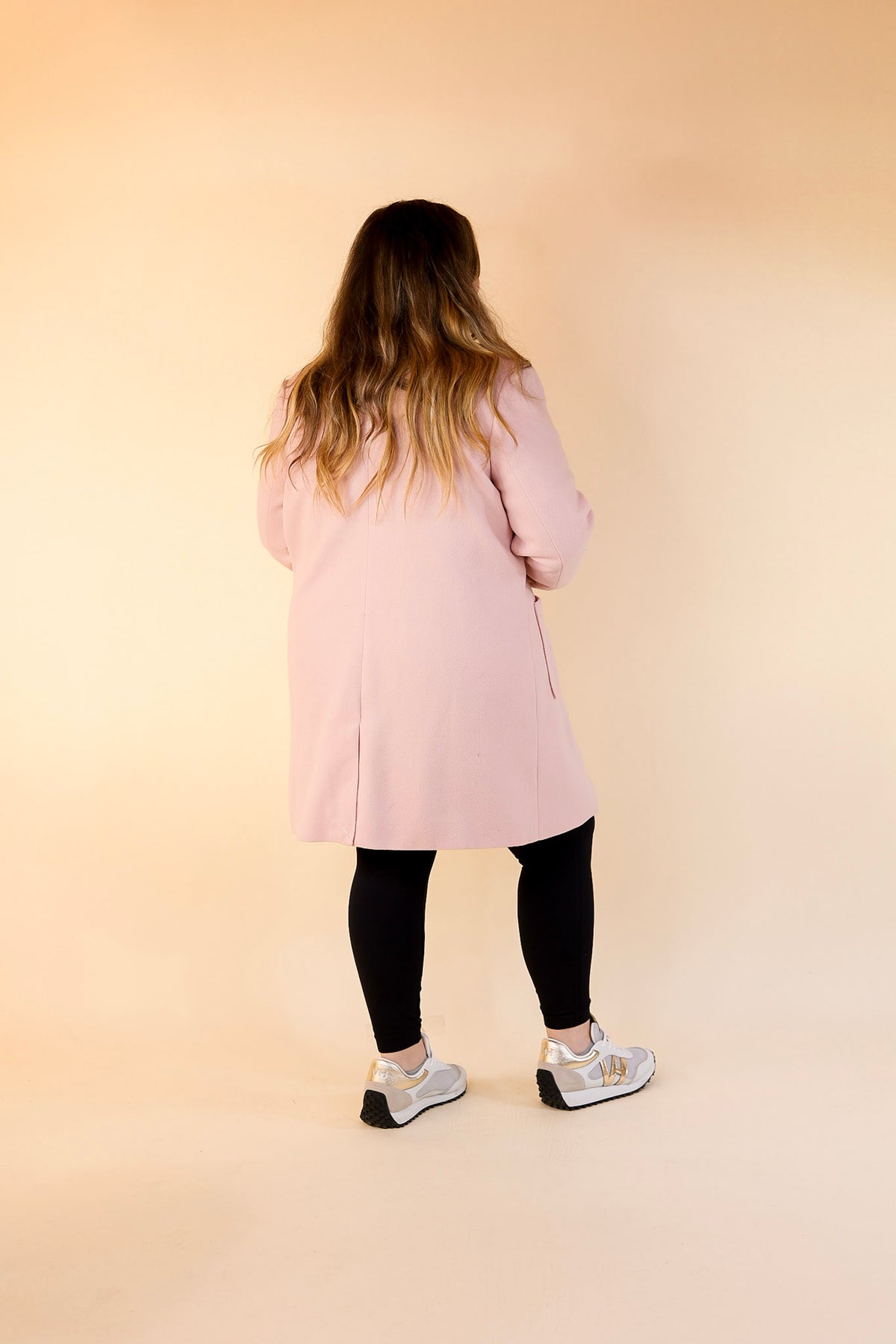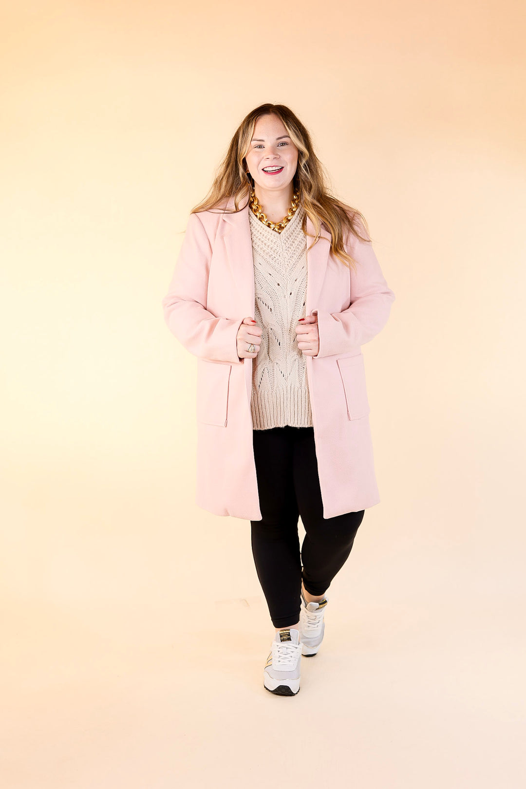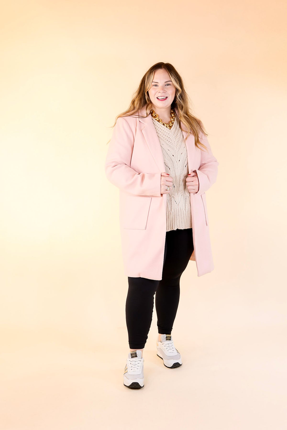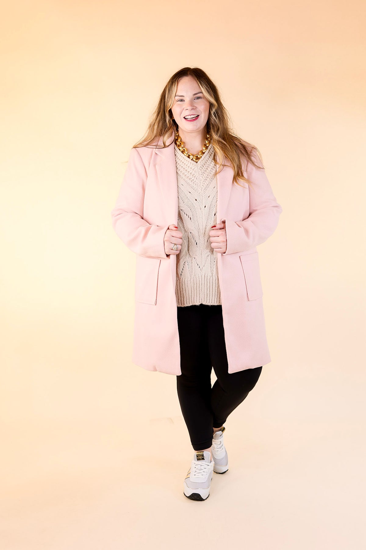 This adorable new coat has us wishing for a European holiday! It includes long sleeves, pockets, an open front, and a long body that ends at the thigh. The thick material makes this the perfect piece to keep you warm this Winter. Pair this adorable coat with a dress and gold jewelry!