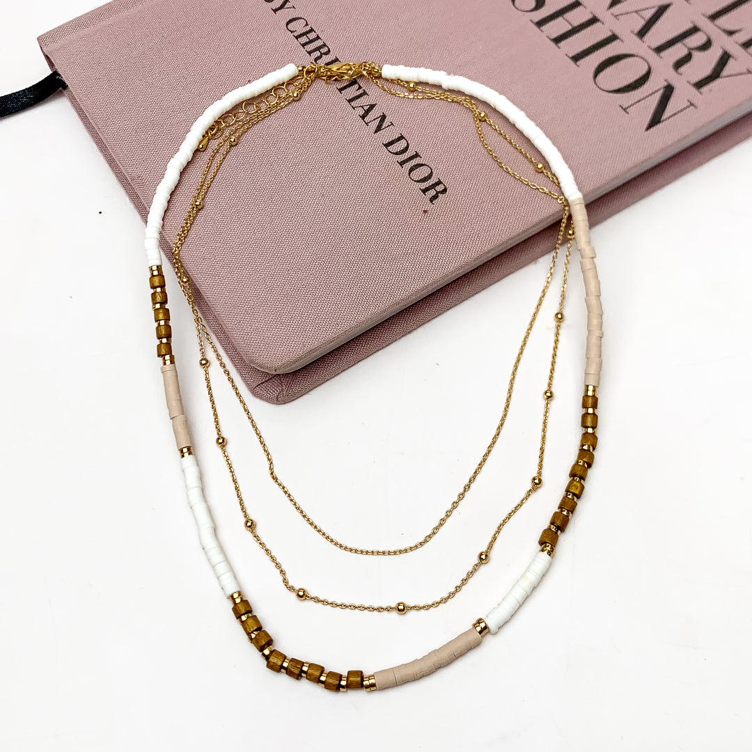 Fall Coastal Multi Strand Gold Tone Necklace in Brown. This necklace is pictured on a white background with part of it on a pink book.