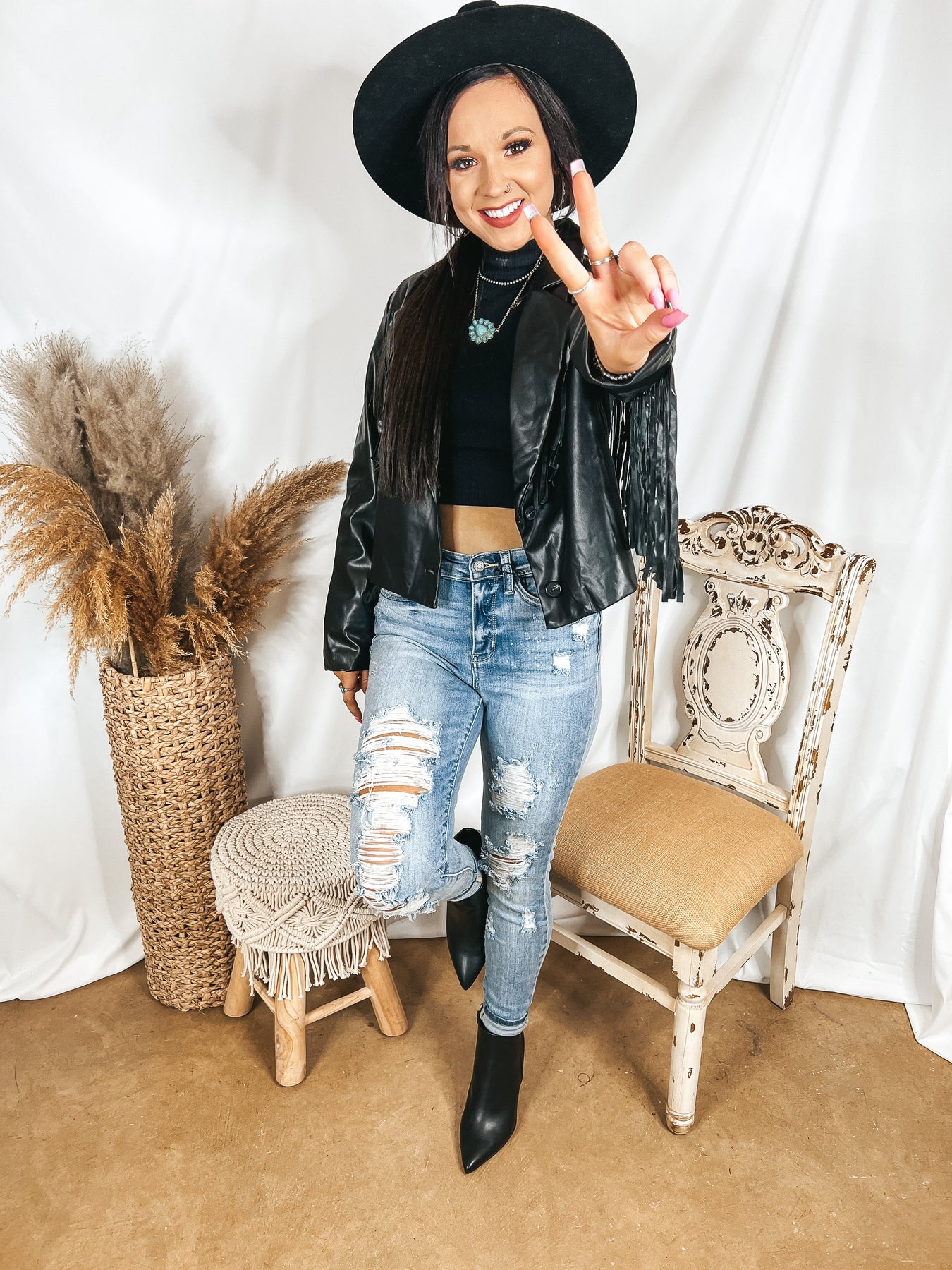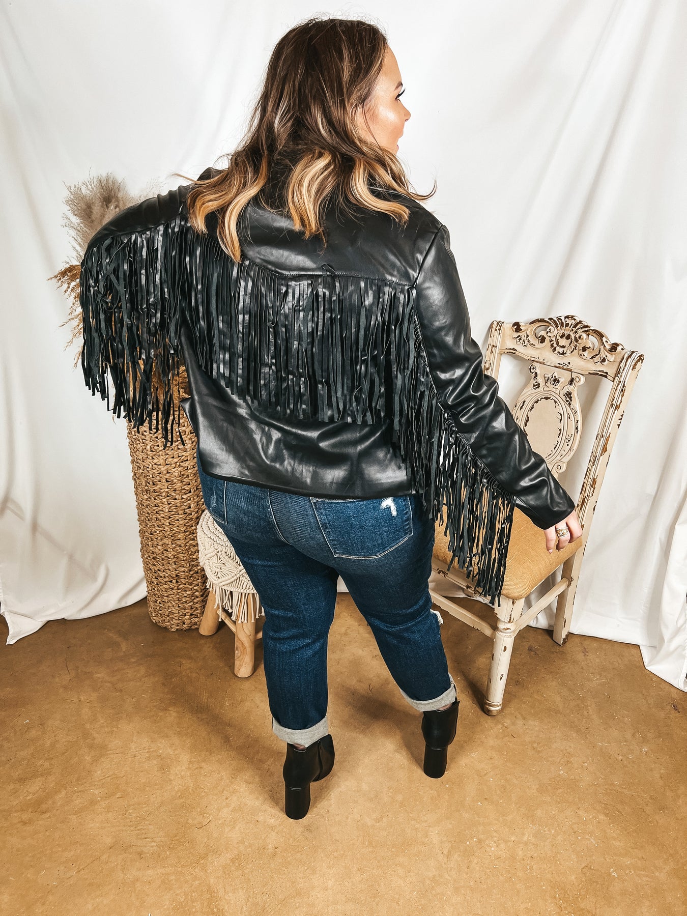 This jacket has style that is out of this world! It includes a faux leather body, long sleeves, button up front, collared neck, and a strand of fringe that runs across the back and down the back of the sleeves. Pair this with a tank top and Charlie 1 Horse hat and you'll be set! Halle is wearing a size small. Abby is wearing a size large.