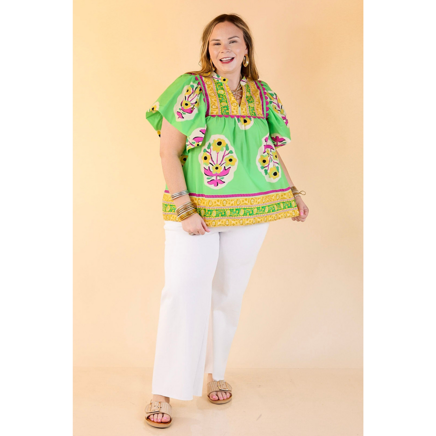 If you loved our Floral Crush Dress, you’re going to fall head over heels for the Floral Blush Top—the same charming style, just in a breezy short sleeve shirt version (minus the smocked bodice). Made in the same soft green fabric and detailed with mixed floral patterns throughout, this top is full of sweet, whimsical touches that set it apart. The purple rickrack trim adds the perfect unexpected pop, while the combination of florals keeps things playful and fresh. It’s easy to dress up or down, and just like the dress, it’s one of those pieces that makes you feel instantly pulled together without any extra effort. Pair it with white jeans, shorts, or a flouncy skirt—you can’t go wrong with this floral favorite.
