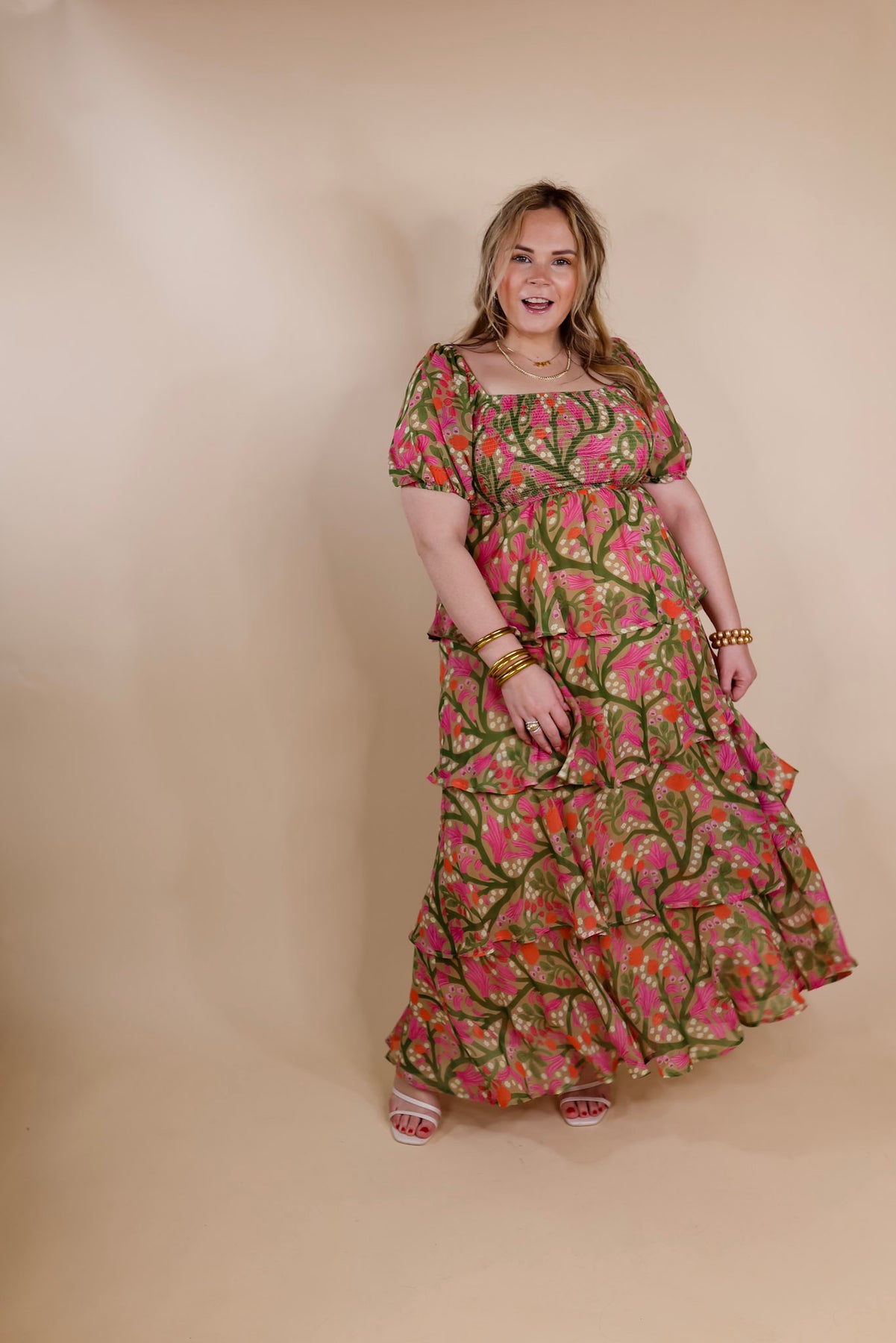 Last Chance Size Small | Fun Feeling Floral Tiered Maxi Dress with Smocked Balloon Sleeves in Green Mix