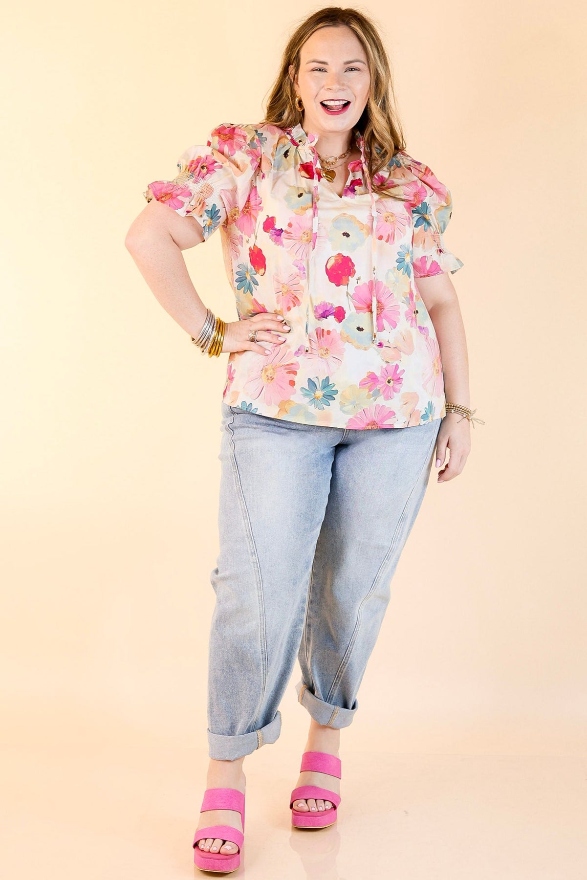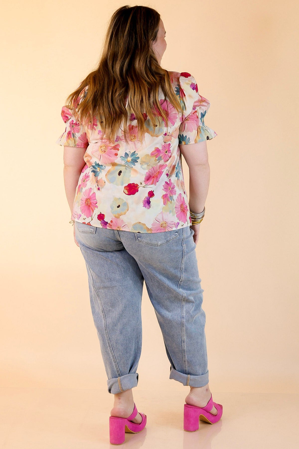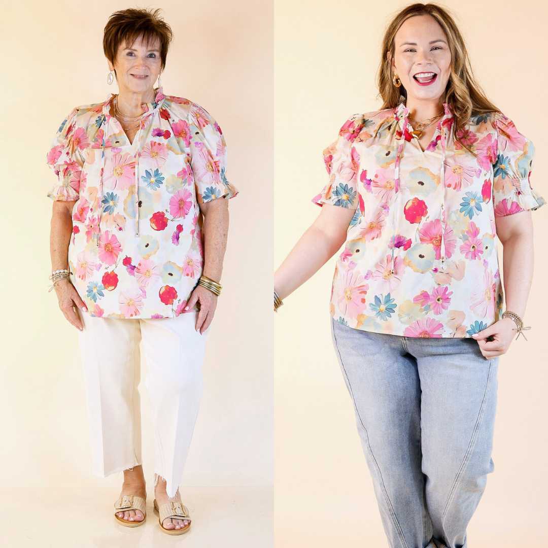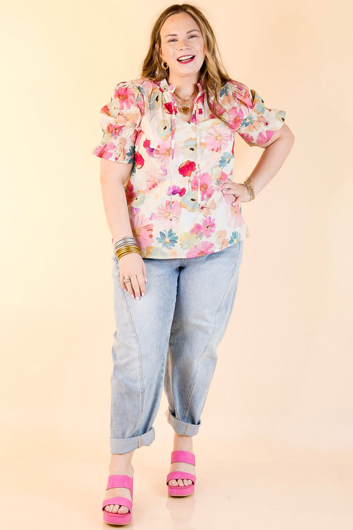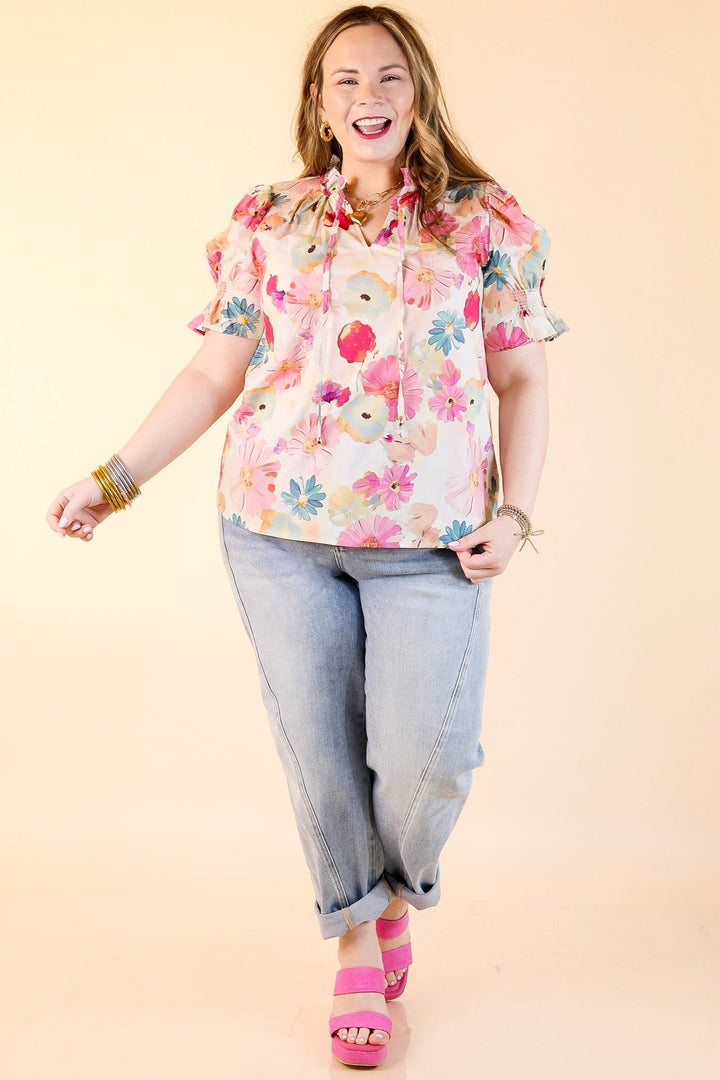 Say hello to sweet spring style with the Freshly Picked top. Featuring a dreamy pastel floral print, this lightweight blouse is made for sunny days and casual charm. The ruffled neckline and tie-front closure add a feminine touch, while the short puff sleeves bring just the right amount of volume. Whether you're heading to brunch, a garden party, or just soaking up springtime vibes, this floral top is your go-to for effortless elegance.