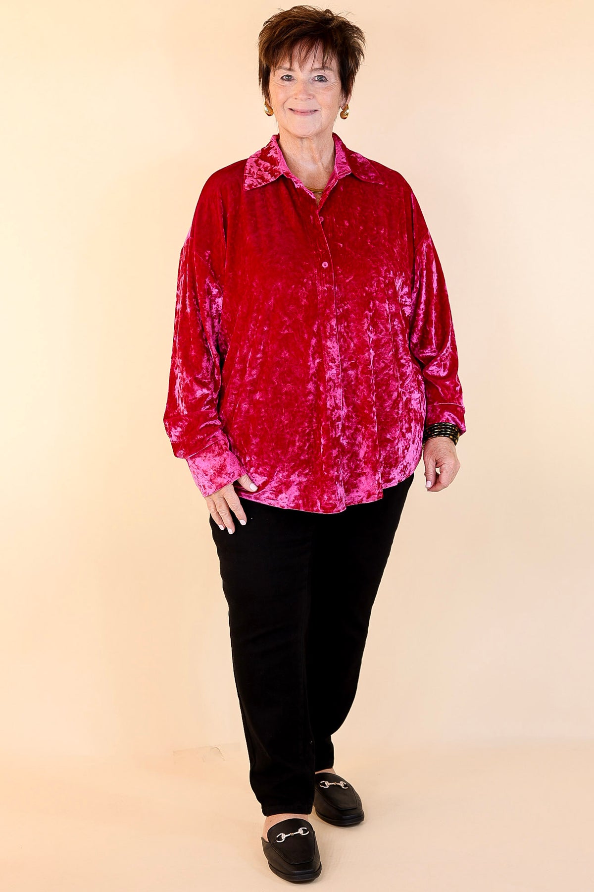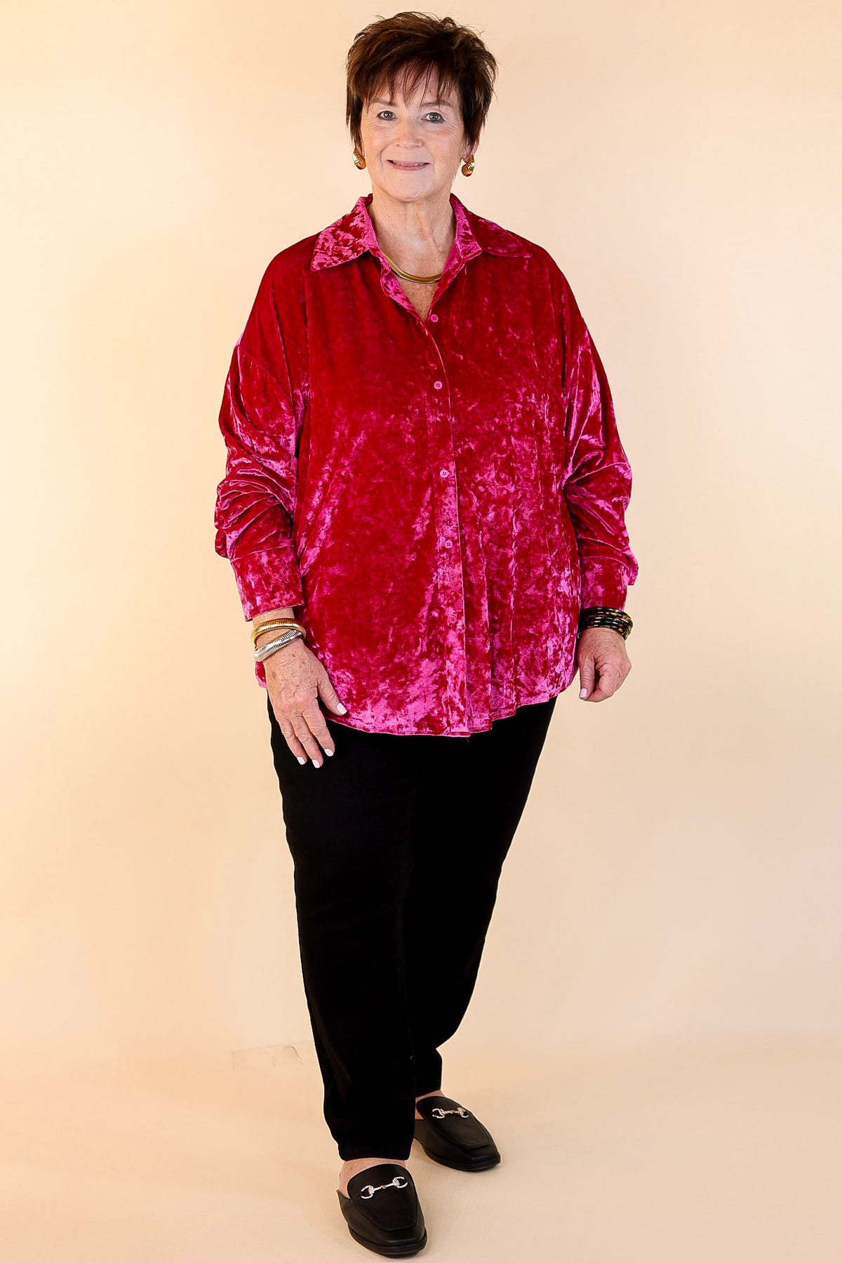 Frosted Glow Velvet Long Sleeve Button Up Top in Magenta Pink