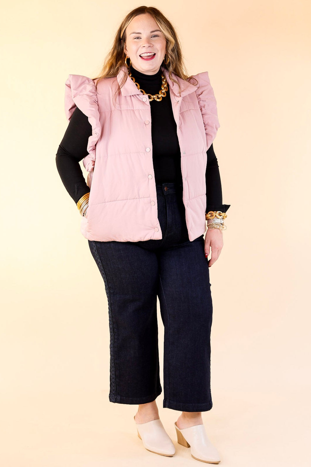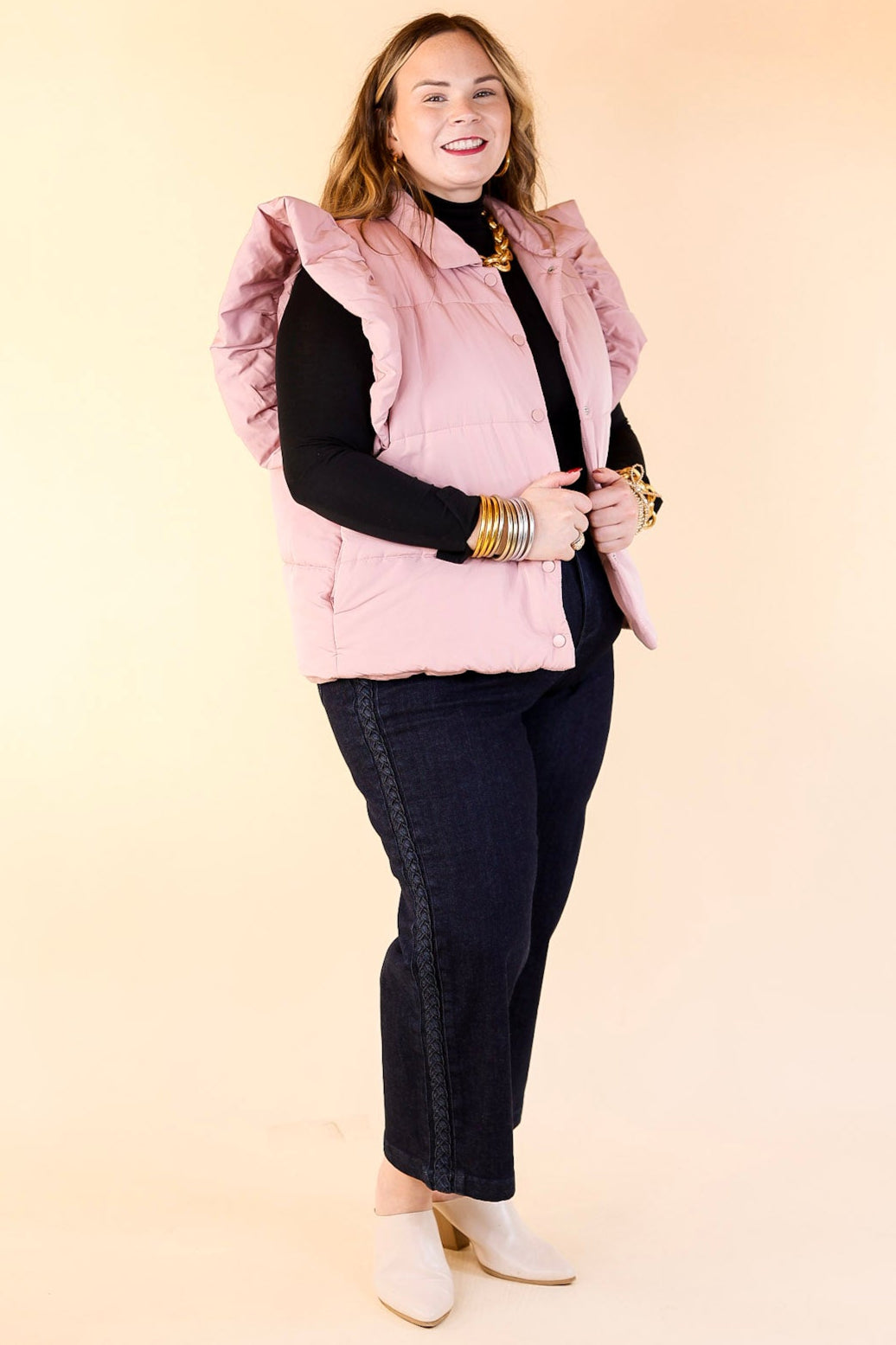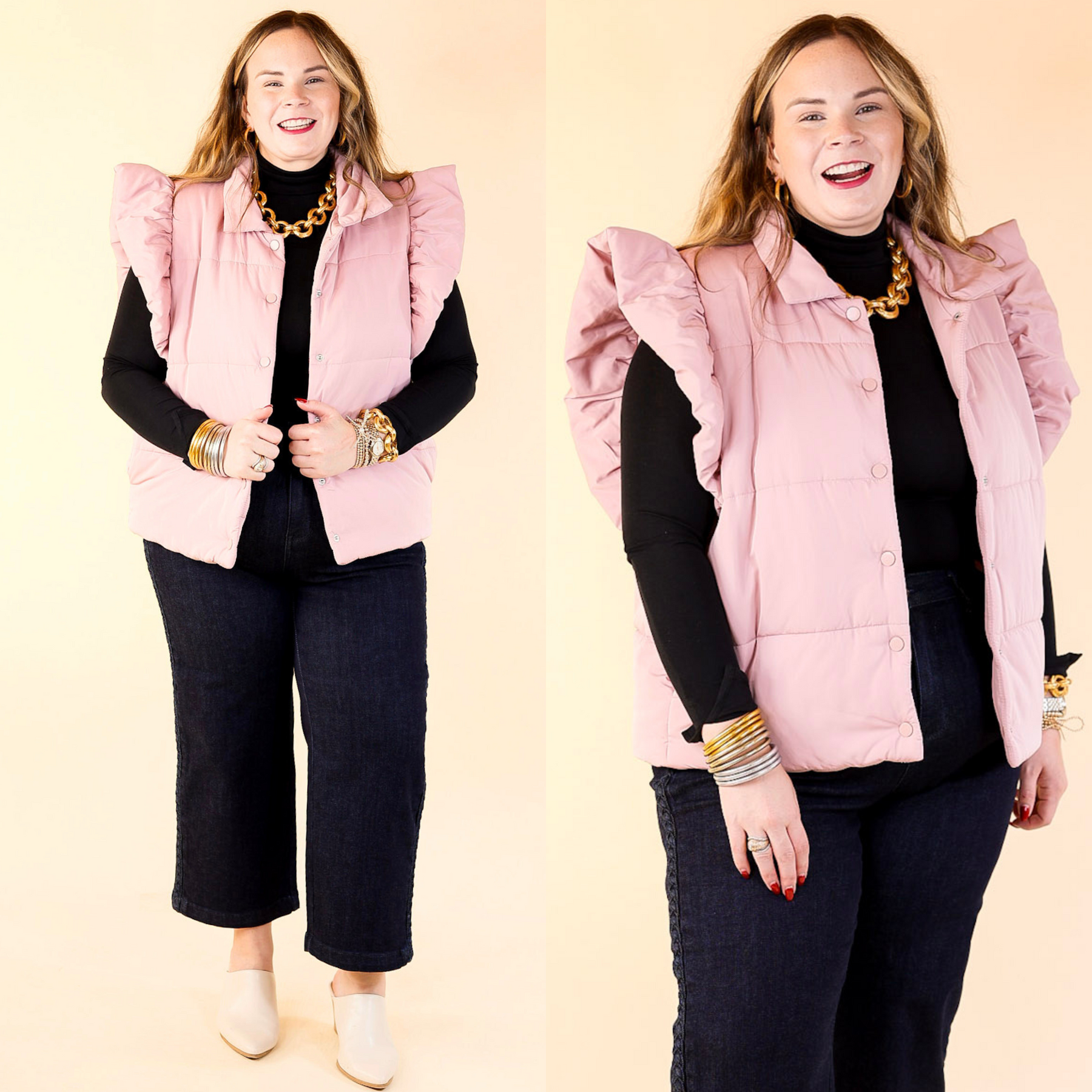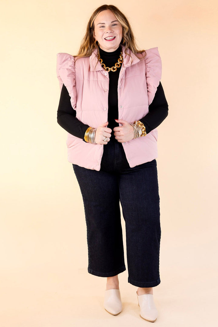 Look and feel magical in our Frozen Enchantments Puffer Vest. This blush pink vest offers statement-making ruffle cap sleeves, a button up front, front pockets, and a high neck for a chic, voluminous look. Stay cozy in style this season!