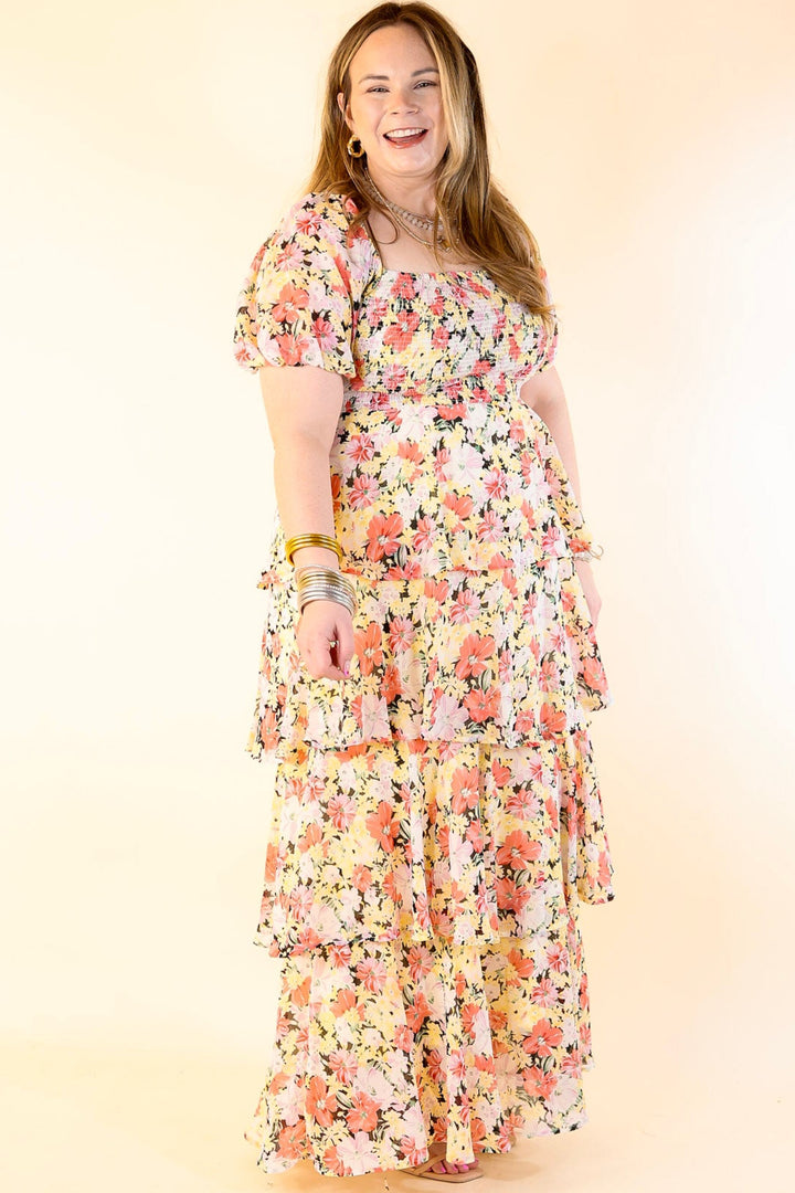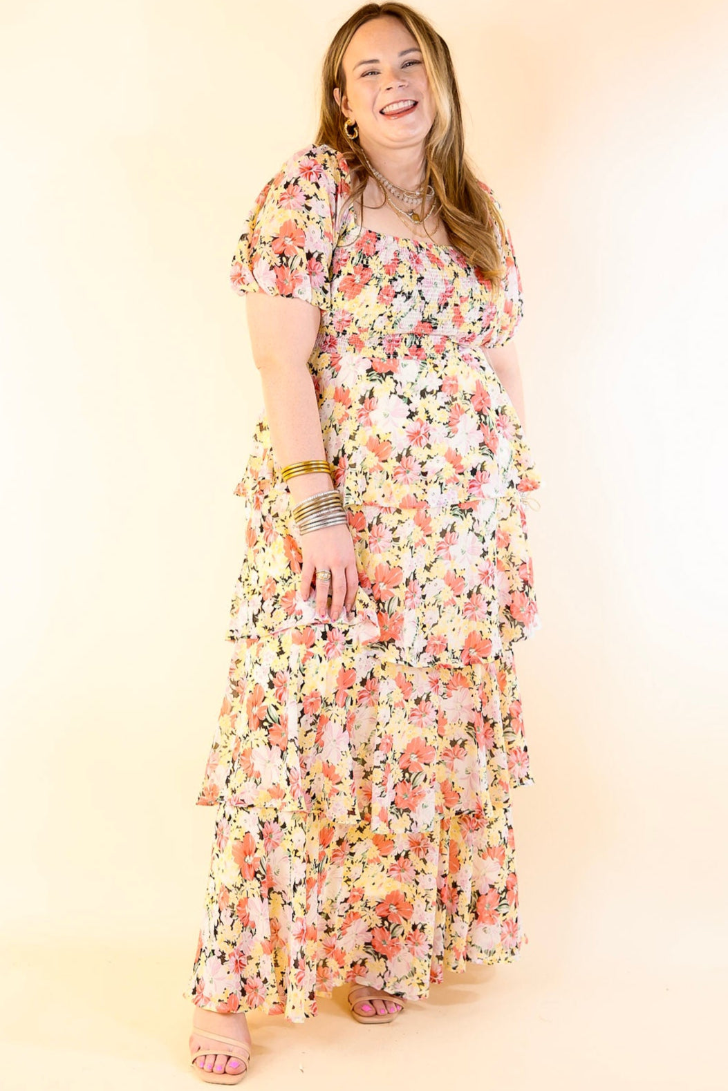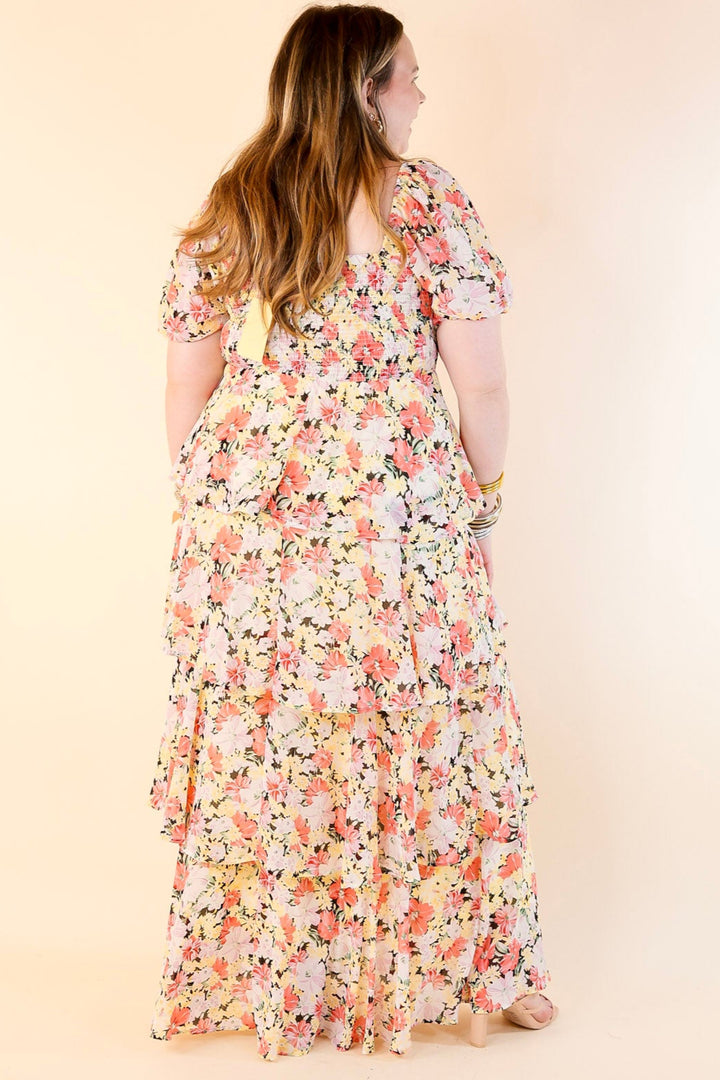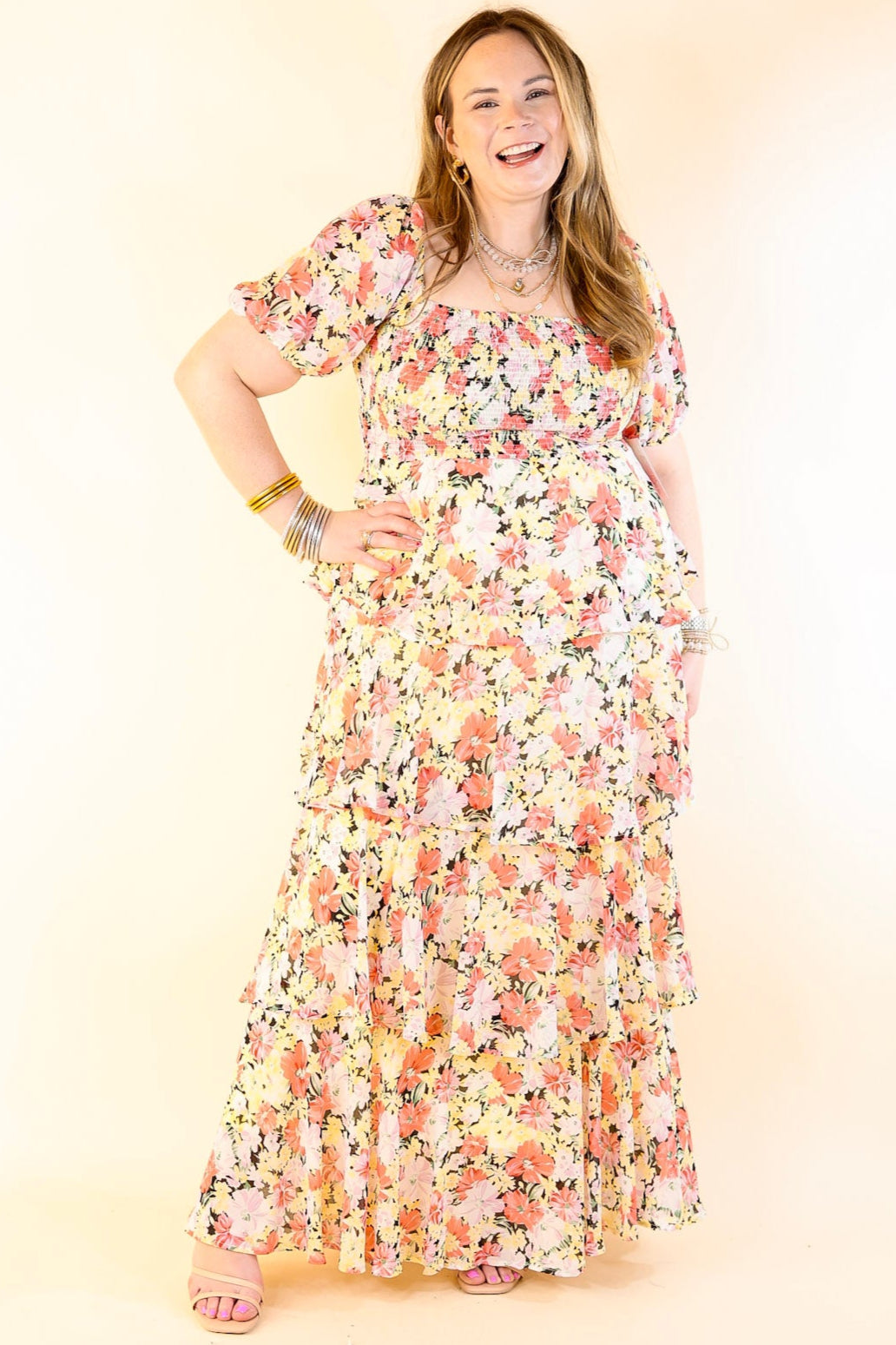 Fun Feeling Floral Tiered Maxi Dress with Smocked Balloon Sleeves in Yellow Mix