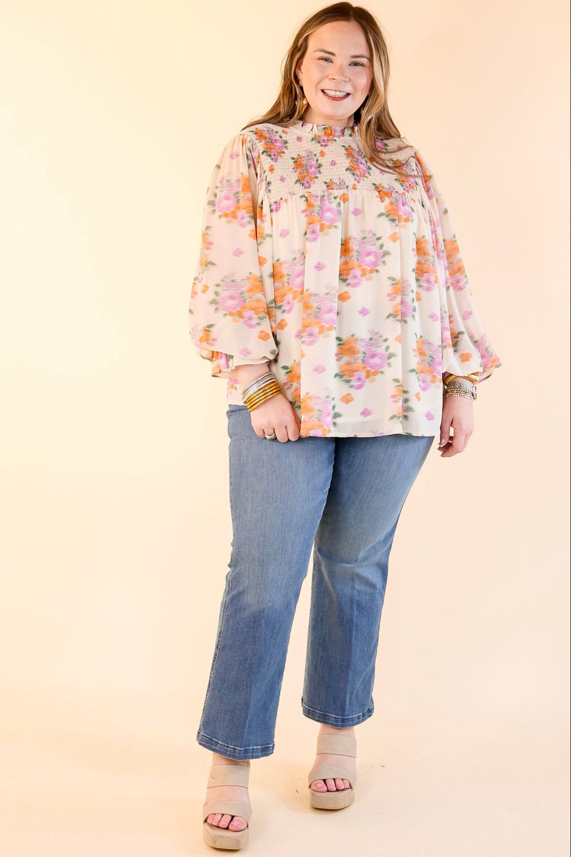 Elevate your style with our charming new blouse, designed to capture the essence of a blooming garden. Embrace its feminine allure with long sleeves adorned with ruffle wrists and a chic high neckline featuring delicate ruffles. The smocked upper adds a touch of elegance, while the vibrant watercolor floral print in shades of green, orange, and purple brings a fresh, springtime vibe. Illuminate your wardrobe with this delightful piece and bloom with every step! Top is lined.