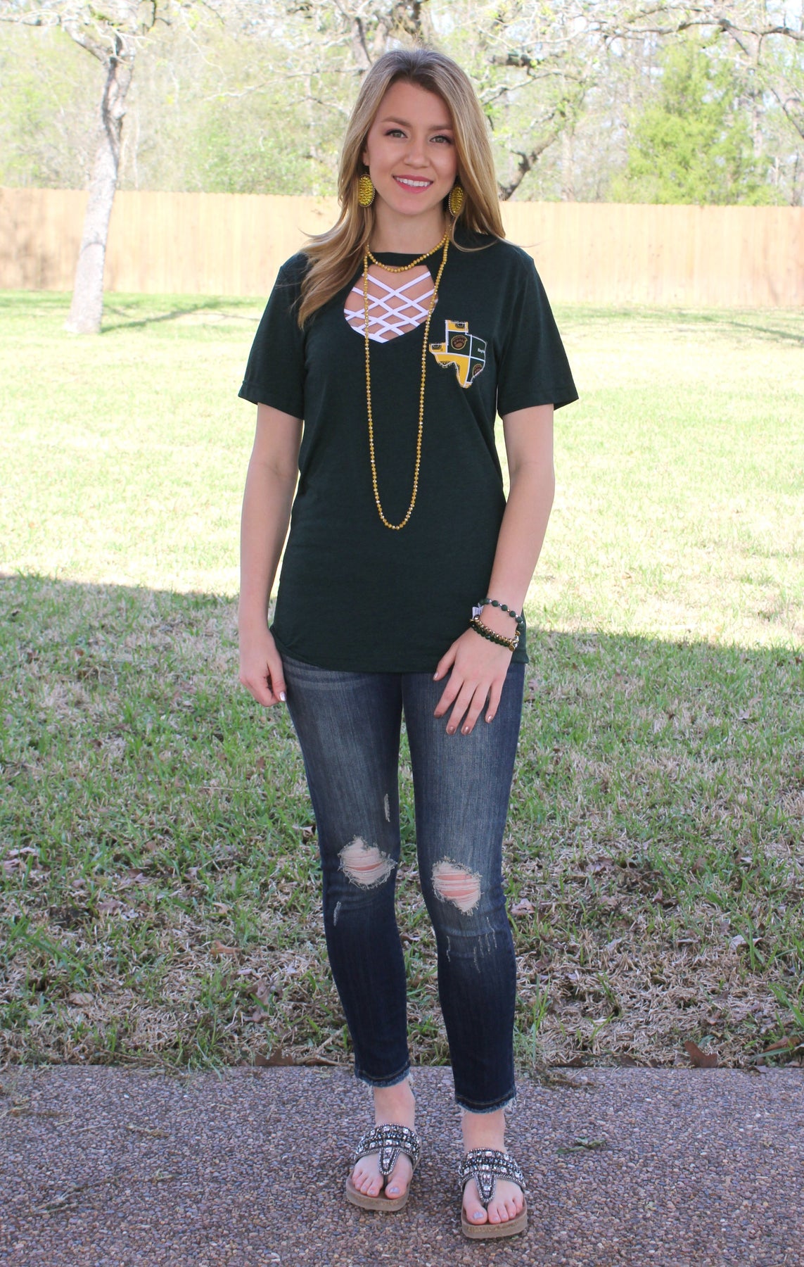Last Chance Size Small, Large & XL | Go Baylor Bears Short Sleeve Tee with Keyhole Cut Out in Heather Green