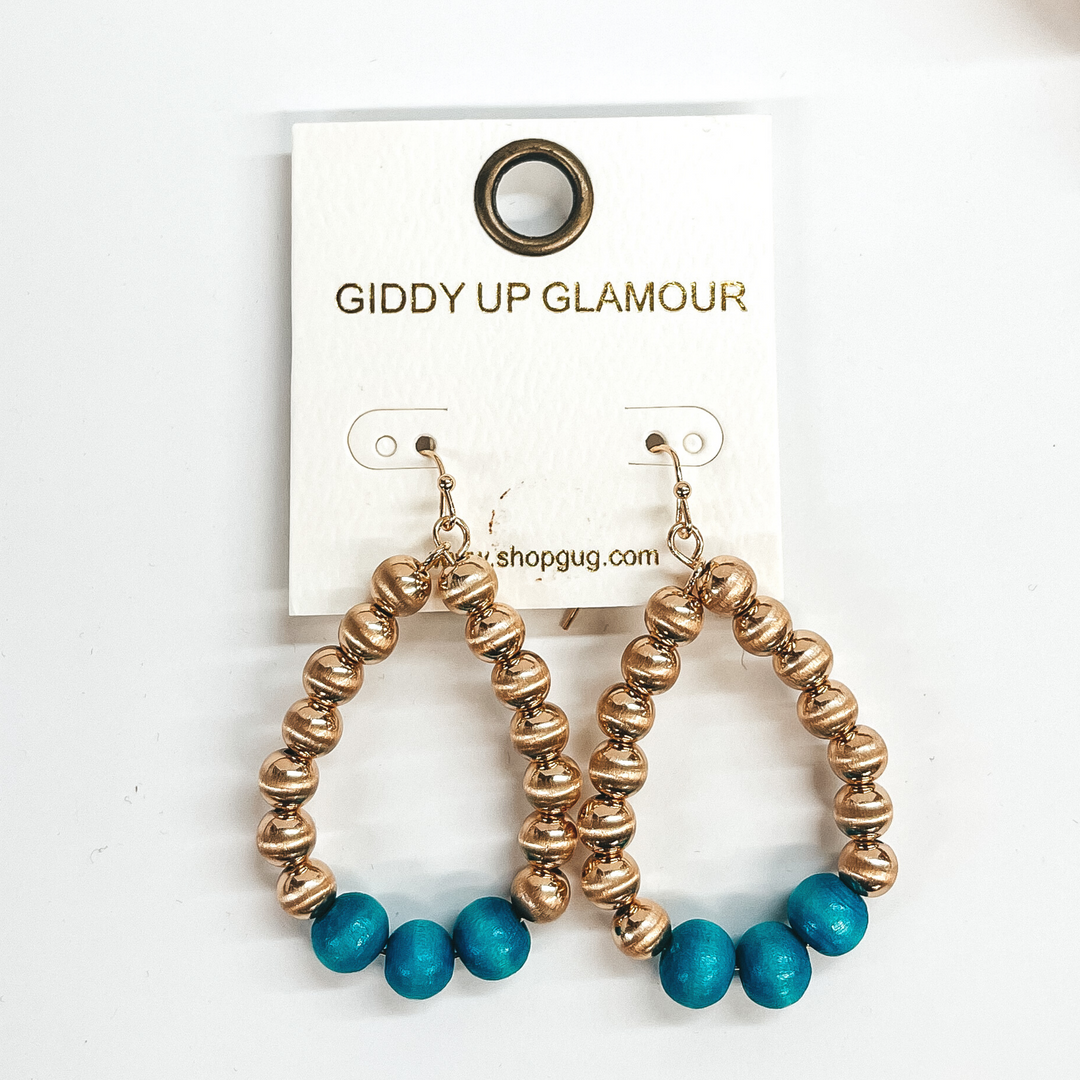 Gold Beaded Teardrop Earrings with Wood Beads in Turquoise