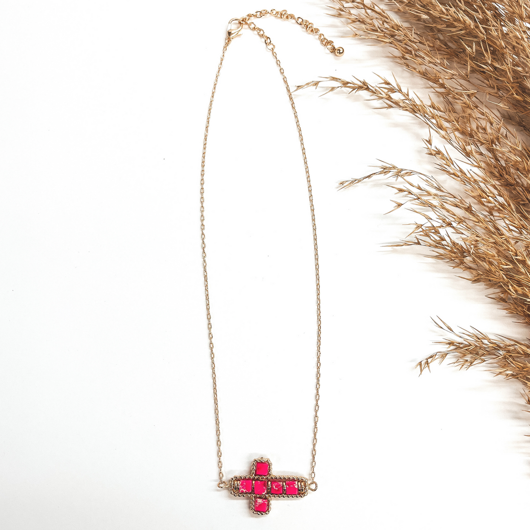 Gold Chain Necklace with Semi-Precious Stone Cross Pendant in Fuchsia Pink