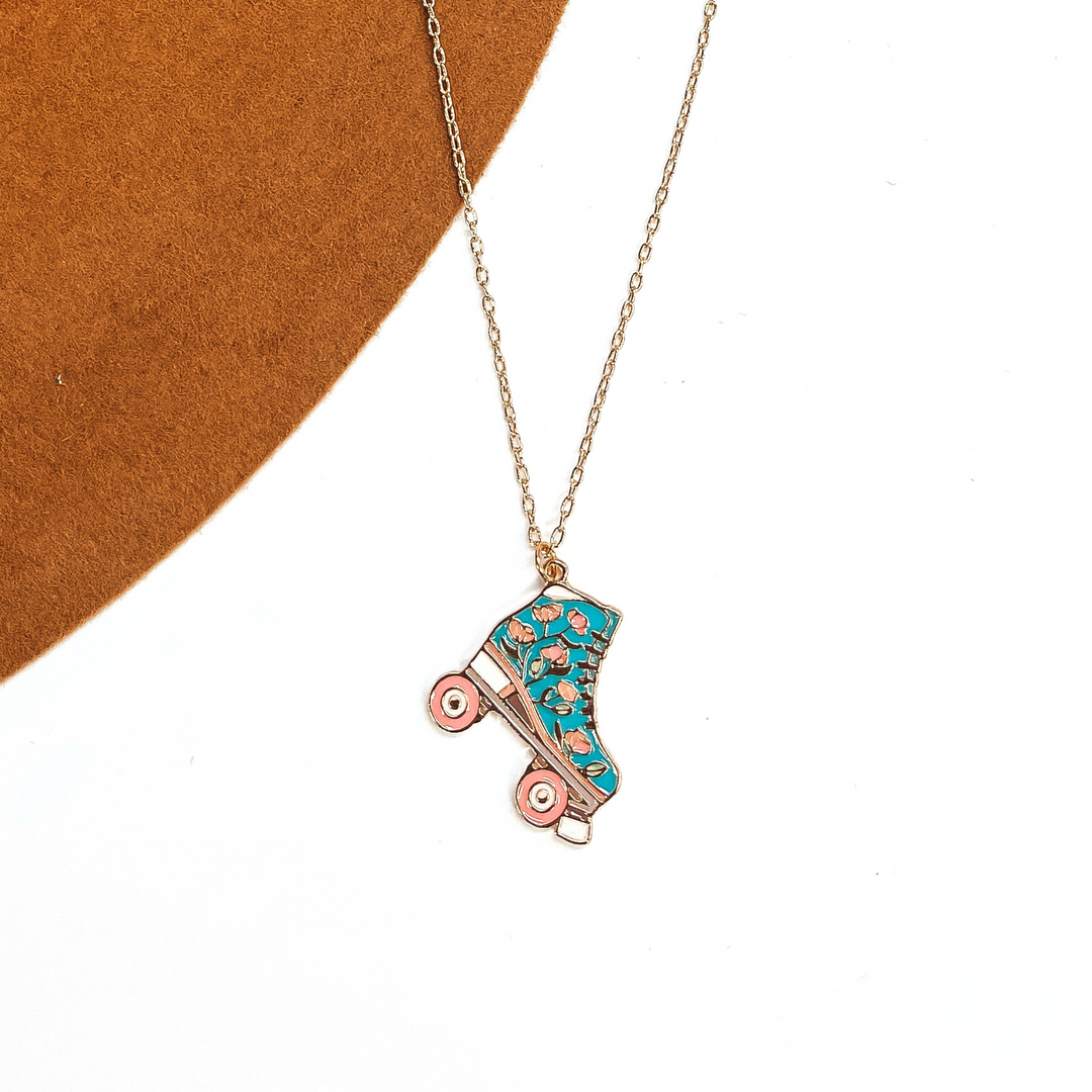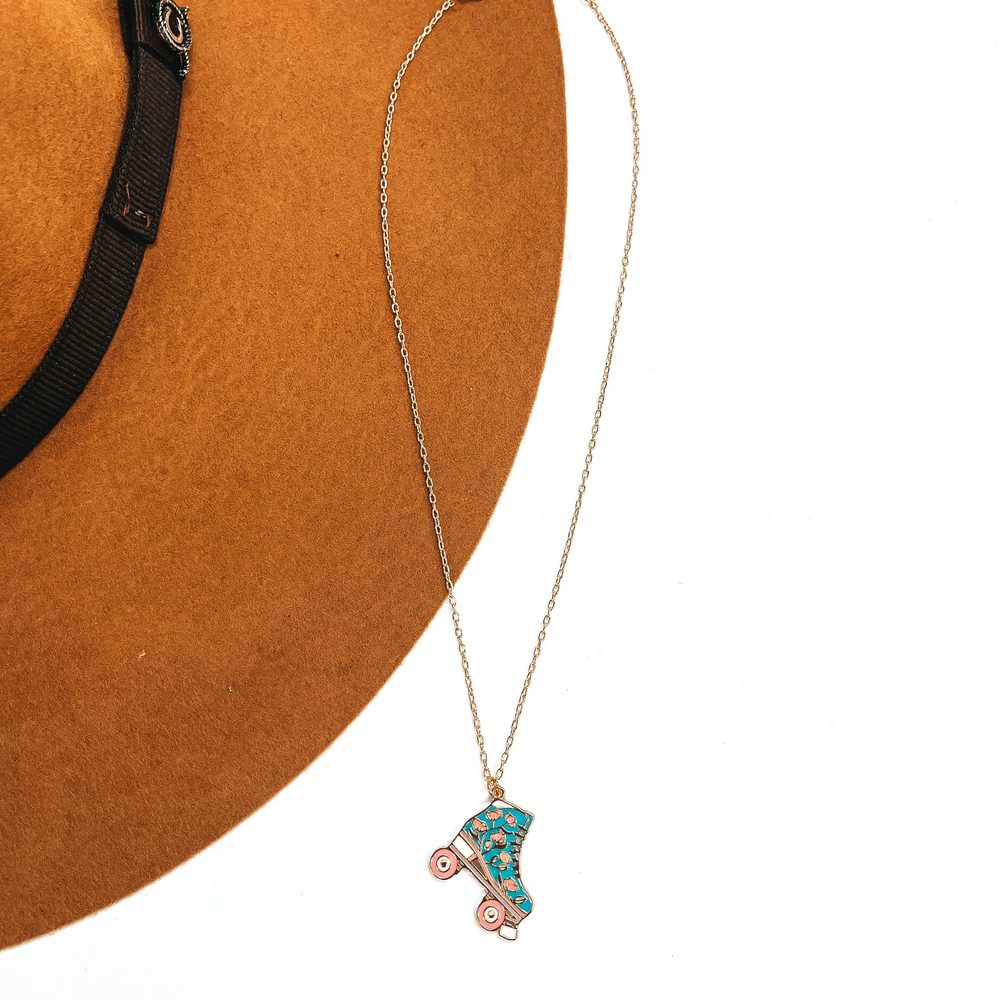 Rink Trips Gold Tone Necklace with Rollerskate Floral Pendant in Turquoise