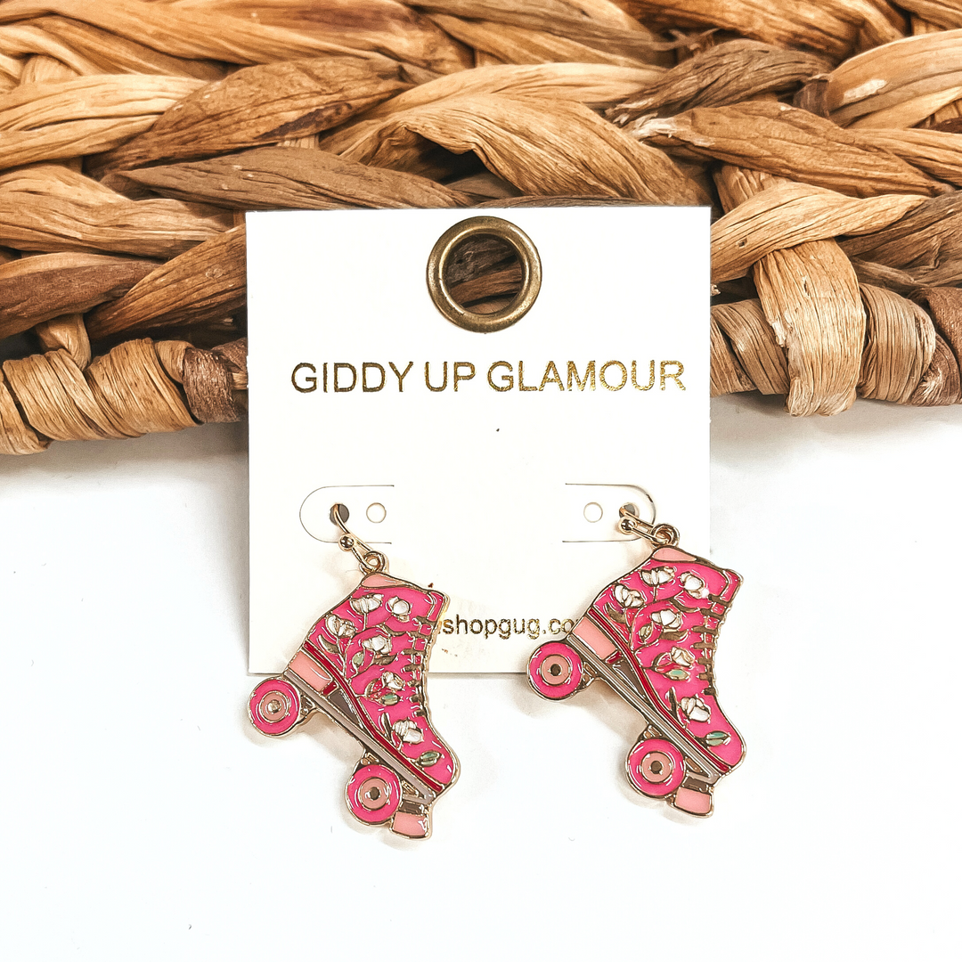 Rink Trips Gold Tone Floral Rollerskate Drop Earrings in Pink