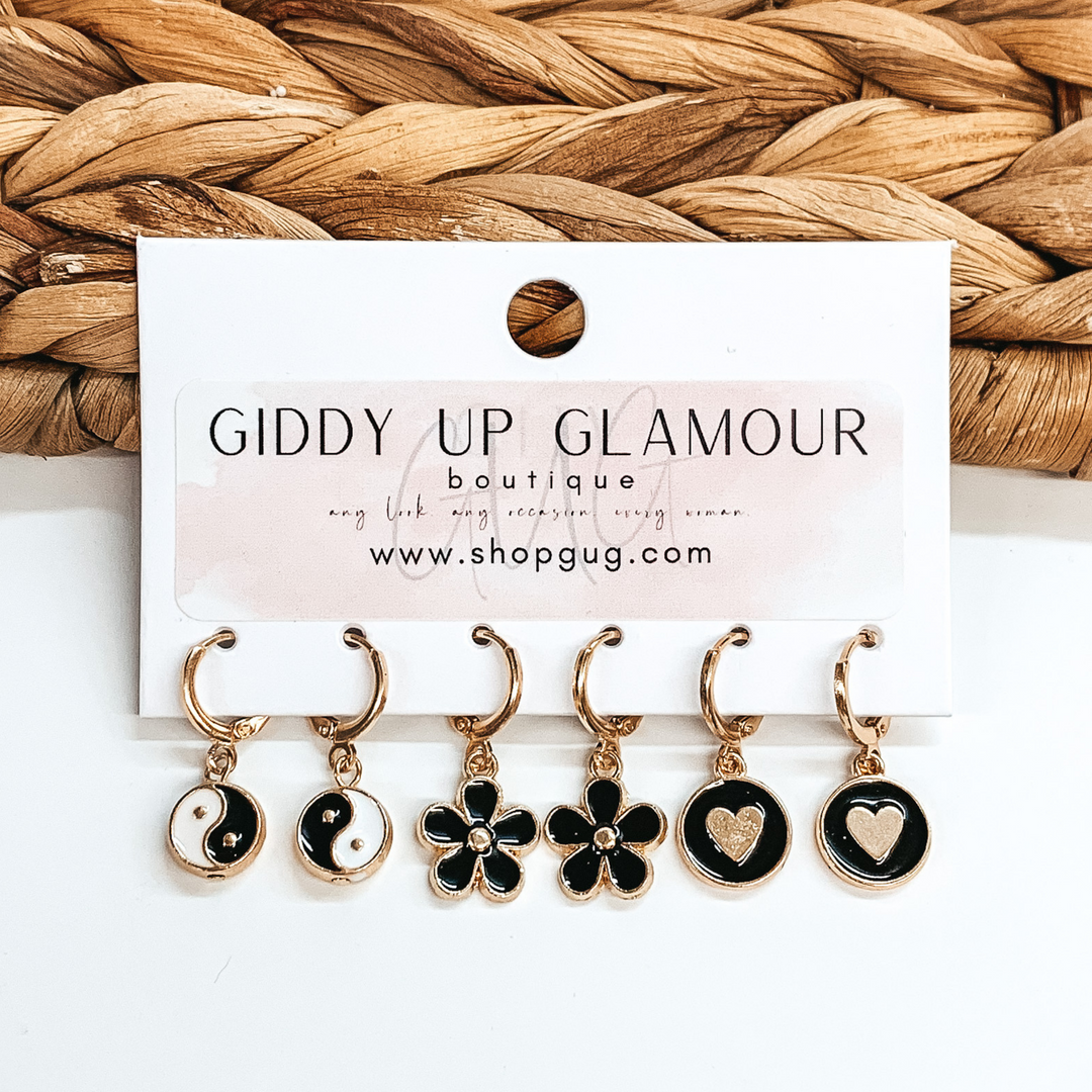 Gold Tone Hoop Huggie Earring Set with Black Groovy Charms