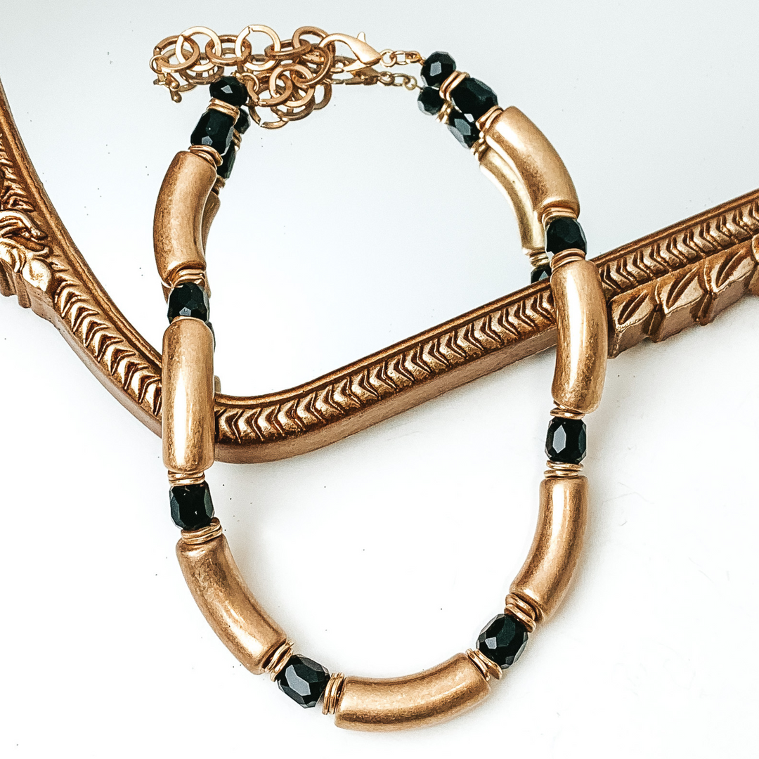 Gold Tone Tube Necklace with Black Crystal Spacers