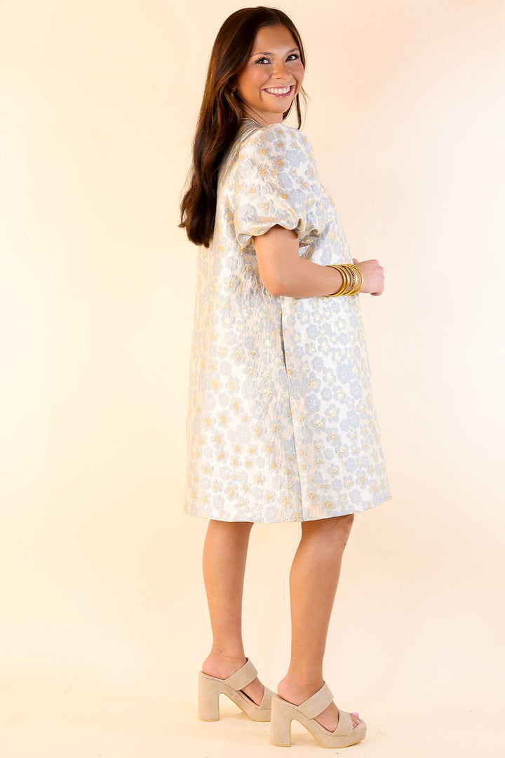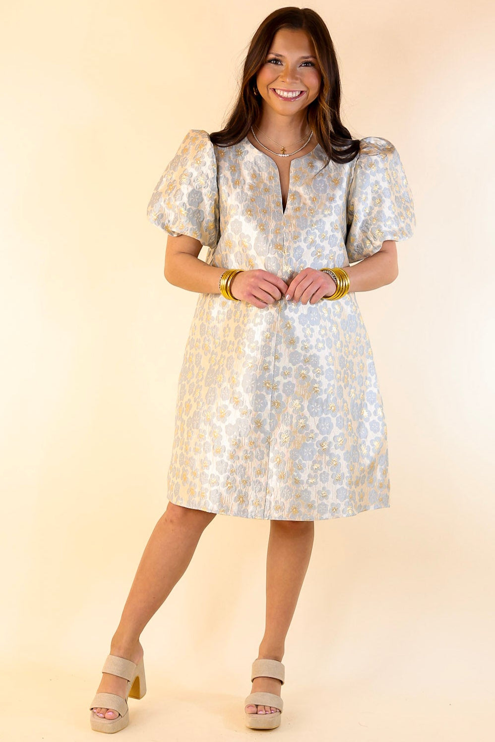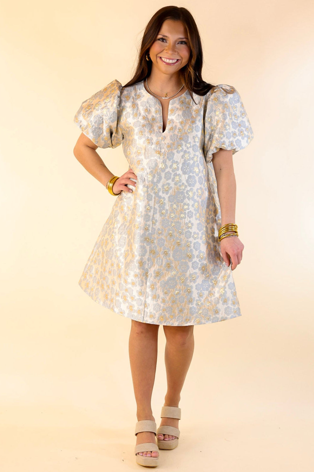 Get ready to steal the spotlight in this stunning floral dress, designed for those who love a little shine. Made from a semi-metallic fabric, this short dress catches the light beautifully, giving you an effortless glow. Featuring short puff sleeves for a touch of volume, a notched neckline for a flattering silhouette, and a gorgeous floral print, this dress is the perfect statement piece for spring and beyond.