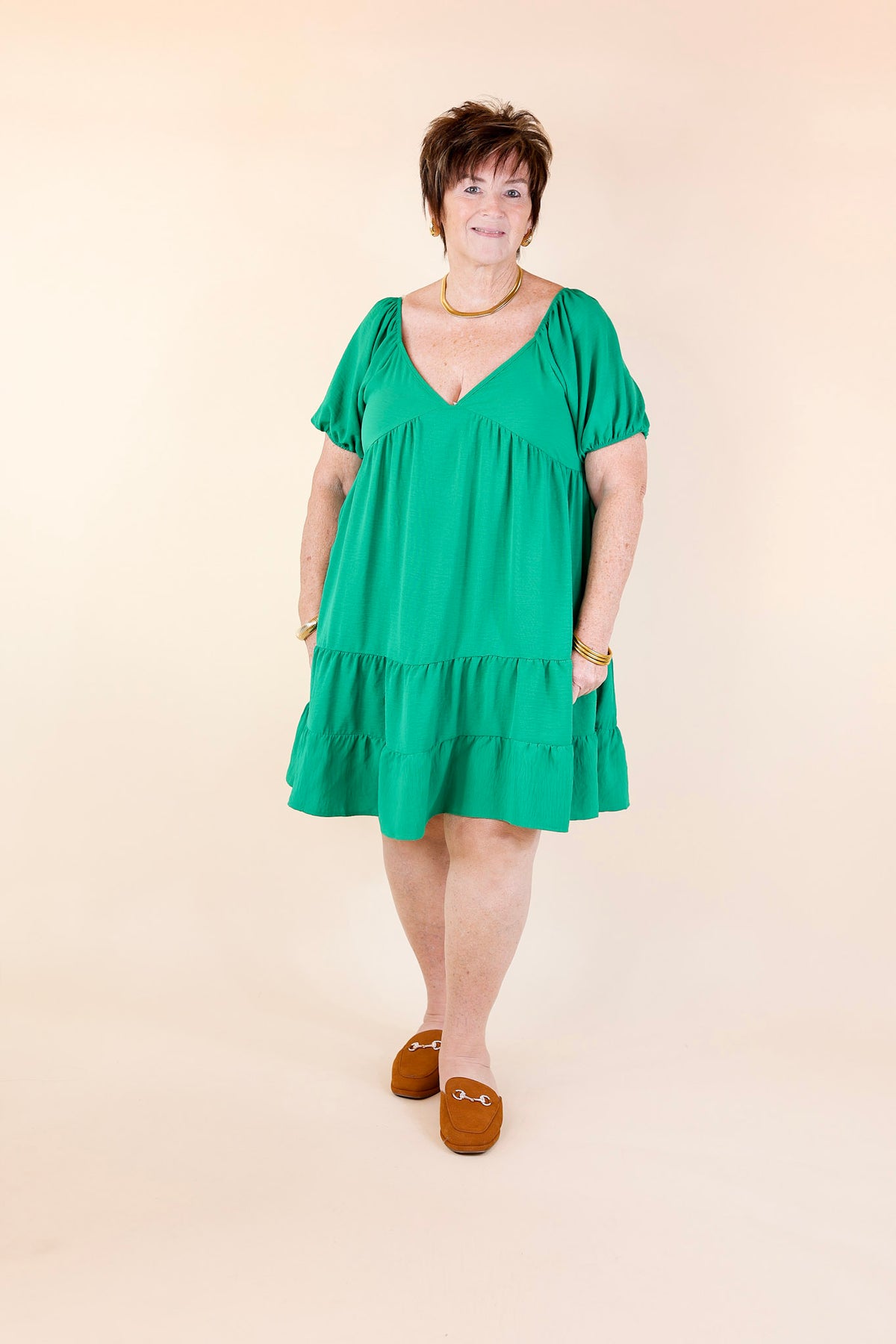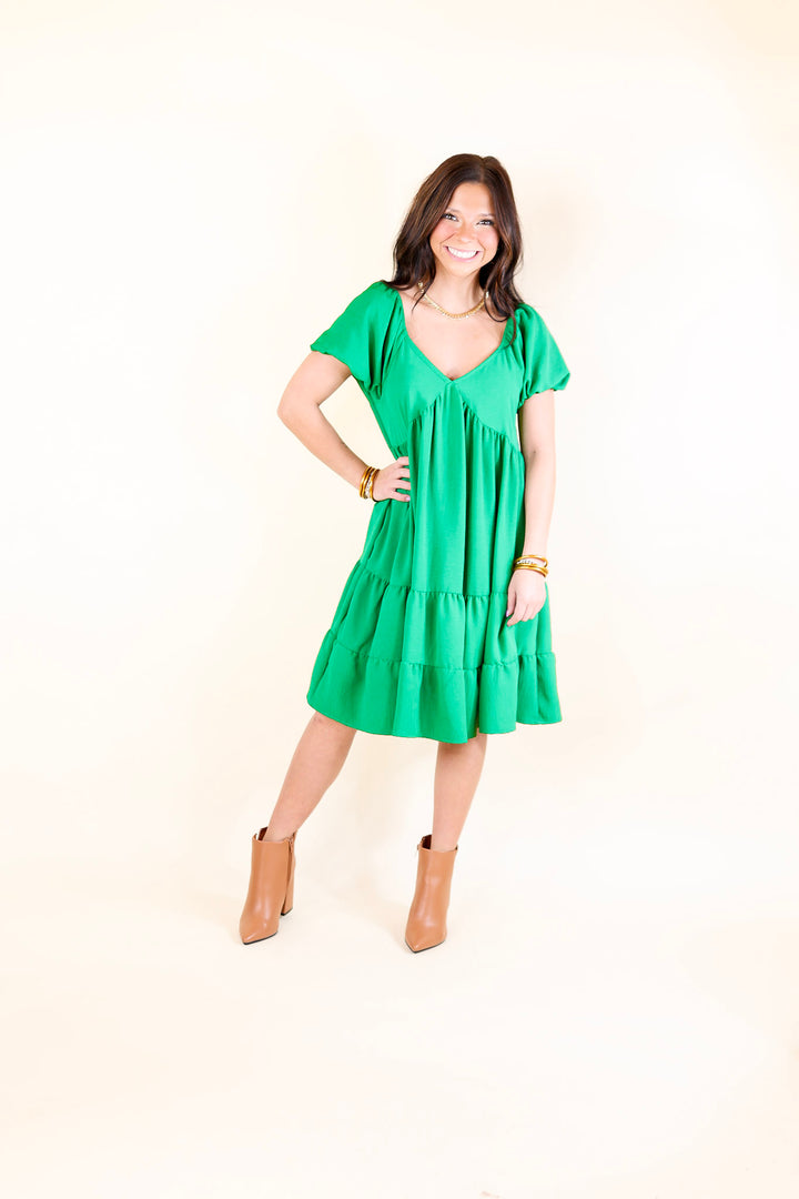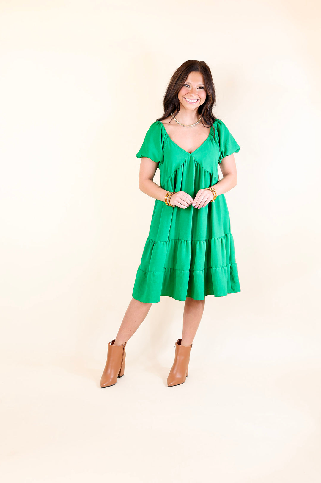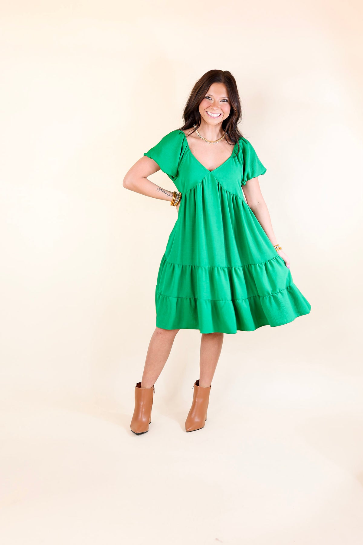 The Graceful Journey dress offers a striking aesthetic, with a v neckline, short balloon sleeves, tiered skirt, and convenient pockets. The refreshing green color brings a cheerful vibe to any day. Effortlessly stylish, this dress is sure to be a hit. Pair this with booties for a cute look! Dress is fully lined.